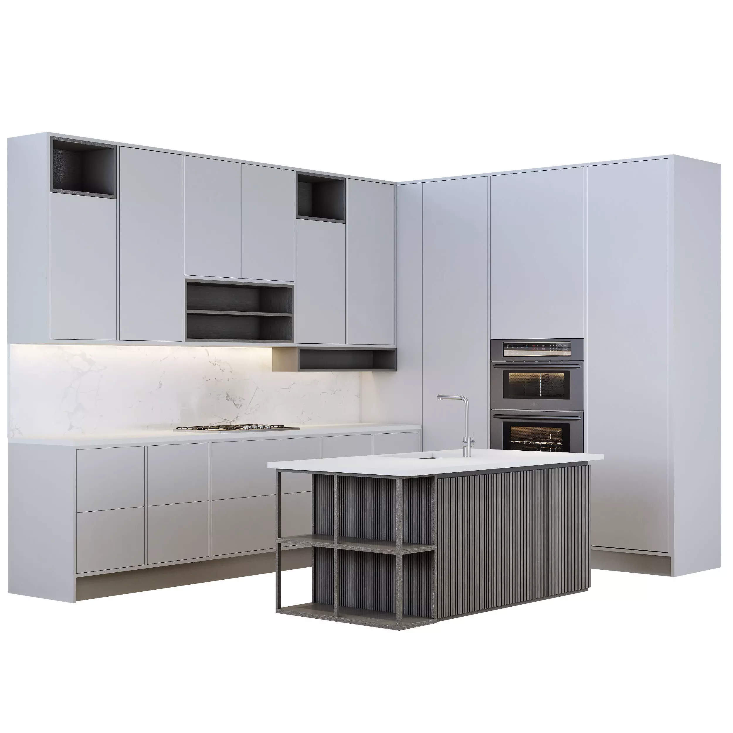 High-quality 3D model of a contemporary minimalist kitchen designed with clean lines and functional elegance. Features include matte gray cabinets, integrated appliances, and a compact island with open shelving and ribbed texture detailing. A white countertop and marble backsplash add a refined, modern contrast. Optimized for VRay and Corona Renderer, making it perfect for architectural visualization, interior renders, and product presentations.