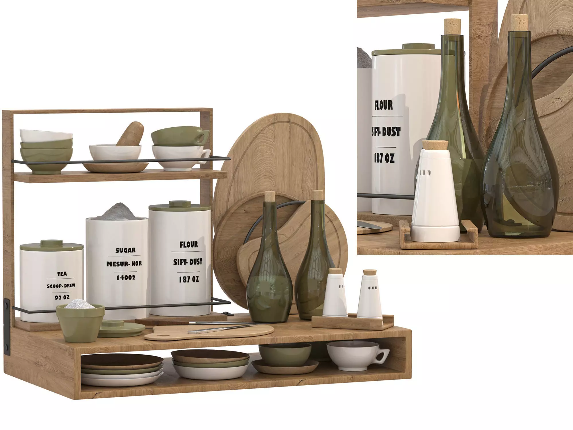 The top shelf holds ceramic bowls and cups in muted natural tones, ideal for creating a cozy, homely feel. A ceramic mortar and pestle add a rustic, traditional touch. The middle section features three labeled storage canisters for tea, sugar, and flour, each with detailed typography and removable lids. The containers are filled with modeled contents (eg, sugar and flour) for maximum realism in close-up shots.