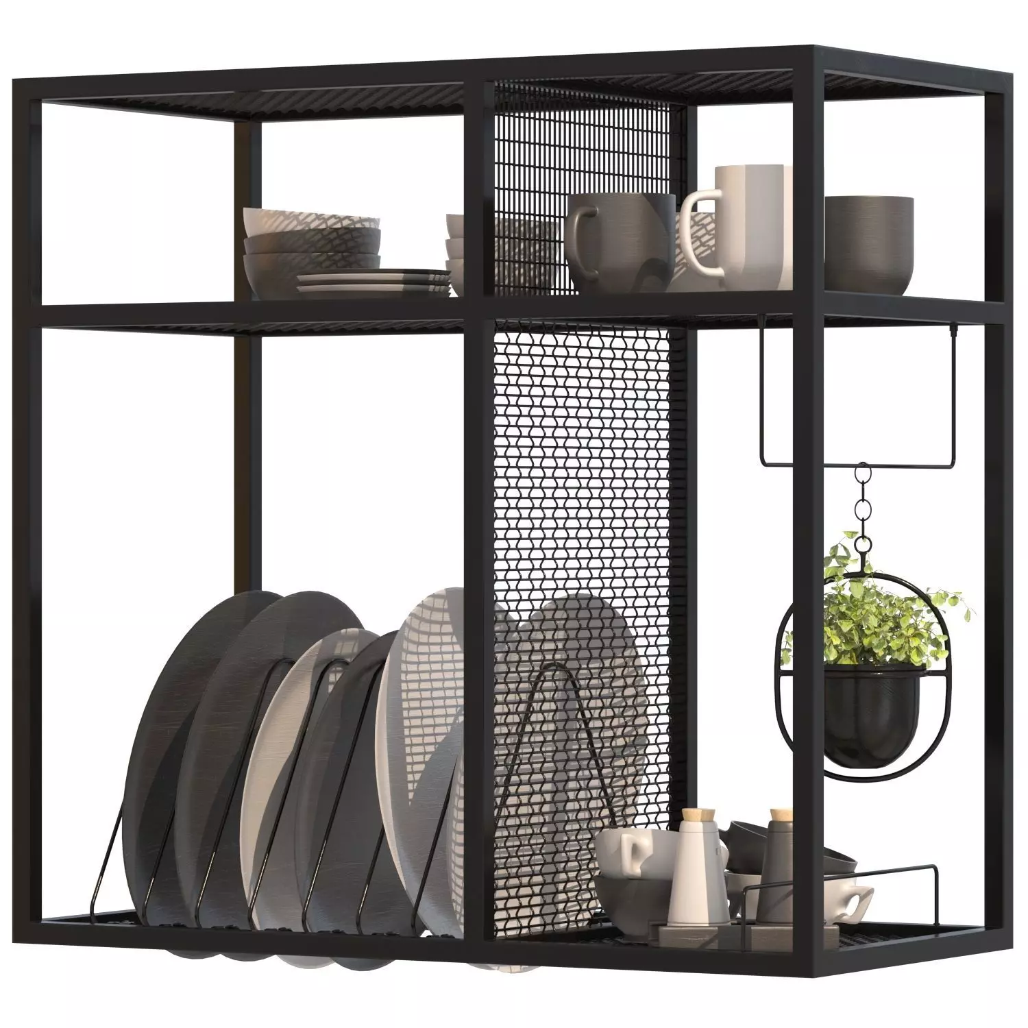 Kitchen Accessory 02Modern black metal kitchen storage unit with functional dish, cup, and utensil organization