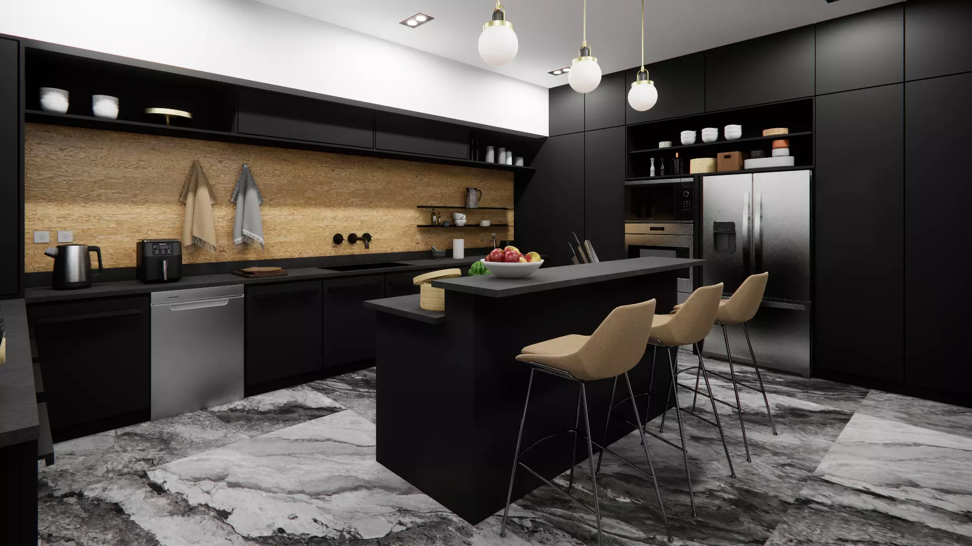 Modern Kitchen and Laundry room space. This file has no protection. It is a modern-styled Kitchen and Laundry room space ready to render with V-ray or Enscape software. One will find FBX files that can be imported into various modeling applications, such as Maya, 3ds Max, SketchUp, and Blender. Inside the file, one will find multiple materials, light setups, and camera angles that can easily be adjusted or changed to personal taste. This file does not have any protection. You can reuse the scene, the render settings, the lights, and the materials, but above all you can learn from the file, moving inside the project, observing how the light was created and handled, how materials are developed, what is the role that every texture play within them, and the values that fill every single option.