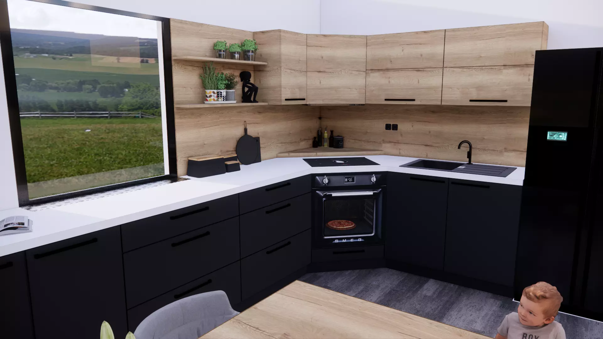 modern designed kitchen by damijan koprivc Modern kitchen.Unique, Highly detailed 3D kitchen design. Modern designed kitchen is custom made by Damijan Koprivc for a costumer. Kitchen model includes table with chairs. File include separate models: ,Owen,sink,hood ,induction plate and handle for drawers. All texture are real ,sold on market under EGGER or KAINDL trademark. 3D KITCHEN Model is done with sketch up and rendered with vray 4 and enscape. Materials/textures are attached together in skp file . All textures ,appliances and furniture equipment is in high resolution,have been checked and are included in scene. Model is easy to manipulate and ready to render with V-ray. Real world scale and exact proportions cm. Realistic and correctly scaled ! • Excellent polygon & texture efficiency Great deal for low price.You get this 3D model kitchen design in formats: skp,... Additional Textures provided with the model: