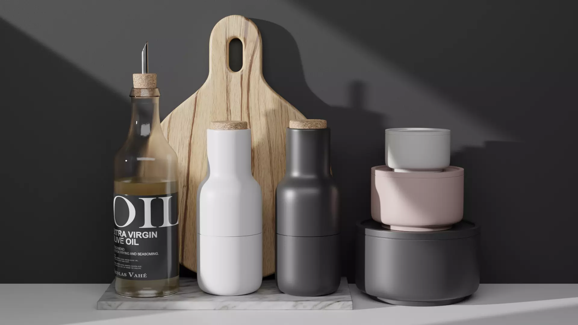 This 3D scene depicts a photorealistic part of a kitchen table, showcasing three stylish matte jars, a wooden cutting board, and three bottles. One of the bottles is transparent and filled with oil, while the other two bottles are also matte with wooden lids. The scene exudes a contemporary aesthetic and provides a visually appealing arrangement of these items. Perfect for showcasing kitchen decor or related products.