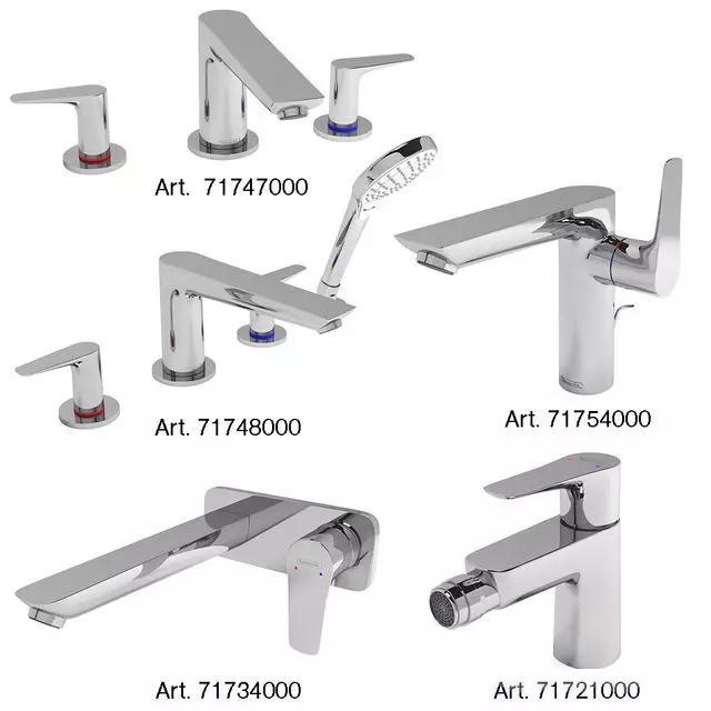1) Talis E Single lever basin mixer SM, spout 225 mmArt. No. 717340002) Talis E Single lever basin mixer 150 with pop-up wasteArt. No. 717540003) Talis E Single lever bidet mixer with pull-out wasteArt. No. 717210004) Talis E 3-hole basin mixerArt. No. 717470005) Talis E 4-hole basin mixerArt. No. 71748000In vray version, BRDF materials are installed in Microfacet GTR / GGX, vray 2.4 owners must install BRDF in Blinn.