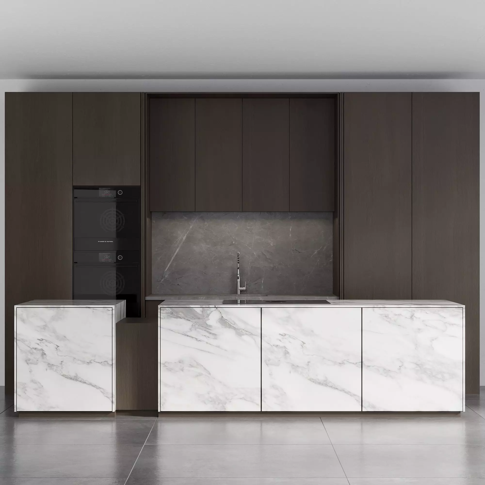 High-quality 3D model of a modern kitchen cabinet set with marble island, featuring both open-door and closed-door versions. The design combines luxurious white marble surfaces with sleek dark wooden panels, offering a perfect balance of elegance and functionality.Integrated appliances, realistic sink details, and optimized geometry make this model ideal for professional interior design, architectural visualization, and luxury kitchen renderings. Provided in two variations for maximum flexibility in projects.