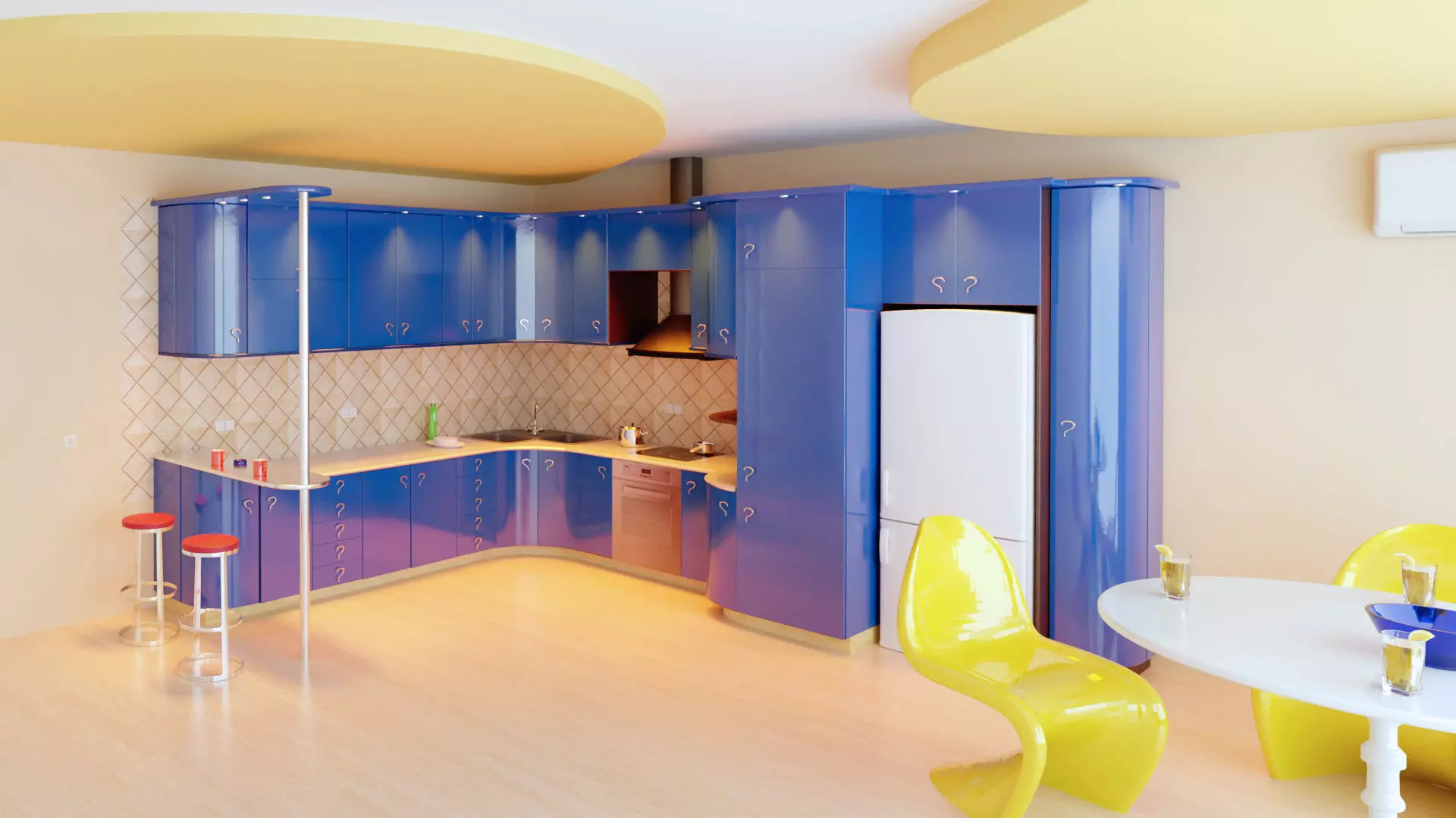 Although red or purple might be appropriate, the kitchen is named after its color.It is a modern type of kitchen. Ideal for young people or a young married couple.And for others who like this design. The form is not established, but it could bethey adapt to the customer's needs and the shape of his kitchen room. This cuisine can also be found in the restaurant. It is most appropriatefor some small fast food restaurants or pastry shops. That's why I posted this onewhite round table with yellow plastic chairs. By the way, at the end is the kitchenmini bar where you can have a quick coffee, juice or tea. Space for one or more built-in ovens can be added later if the customer so desires. The door handles are in the shape of a stylized question mark. Does not existsome symbolism, but just an interesting design.