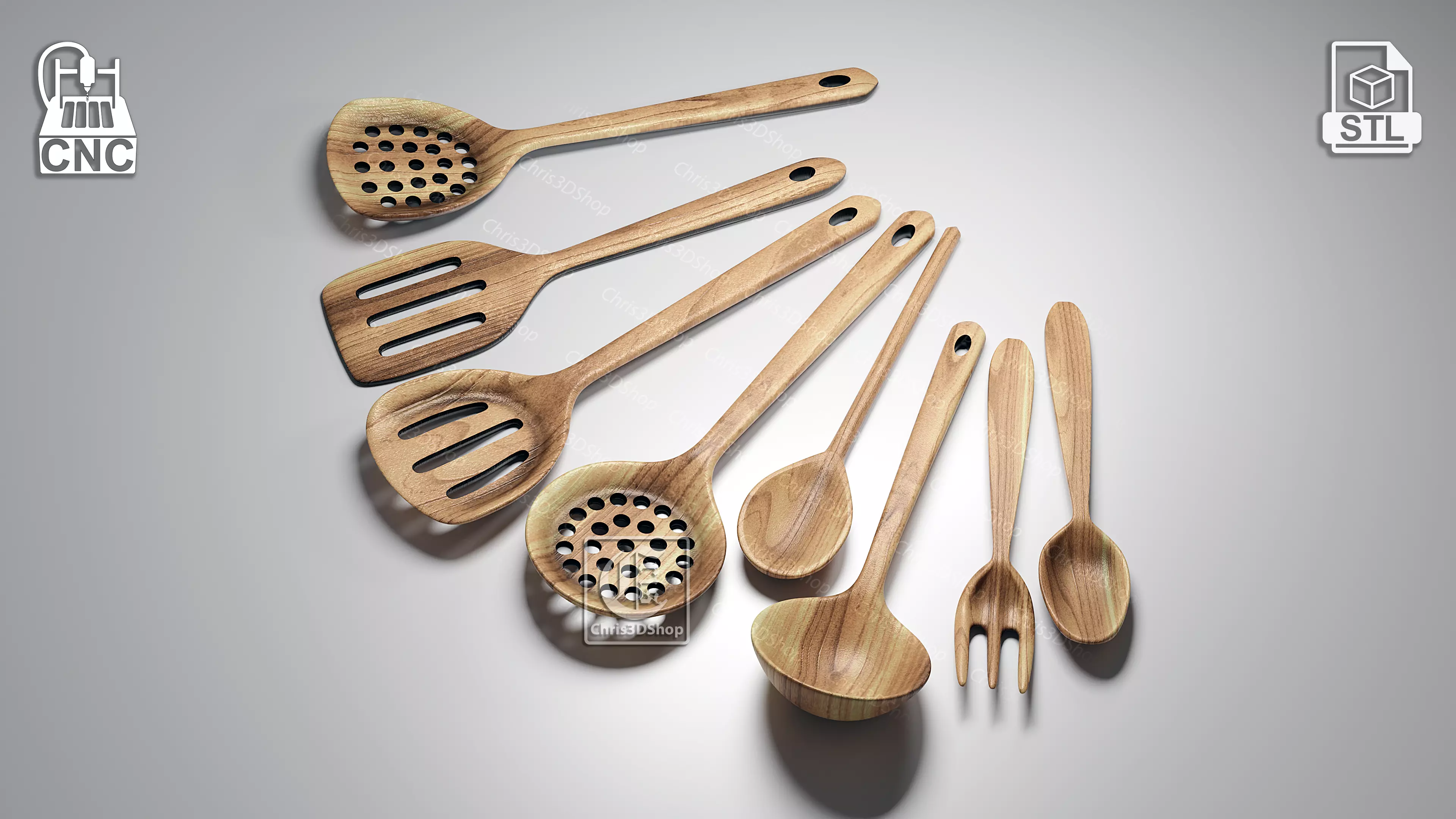 Kitchen Utensils – STL FilesCompatible with Aspire, VCarve, Carveco, ArtCAM, or any software that supports the STL format. Designed to be manufactured from wood using a CNC router.