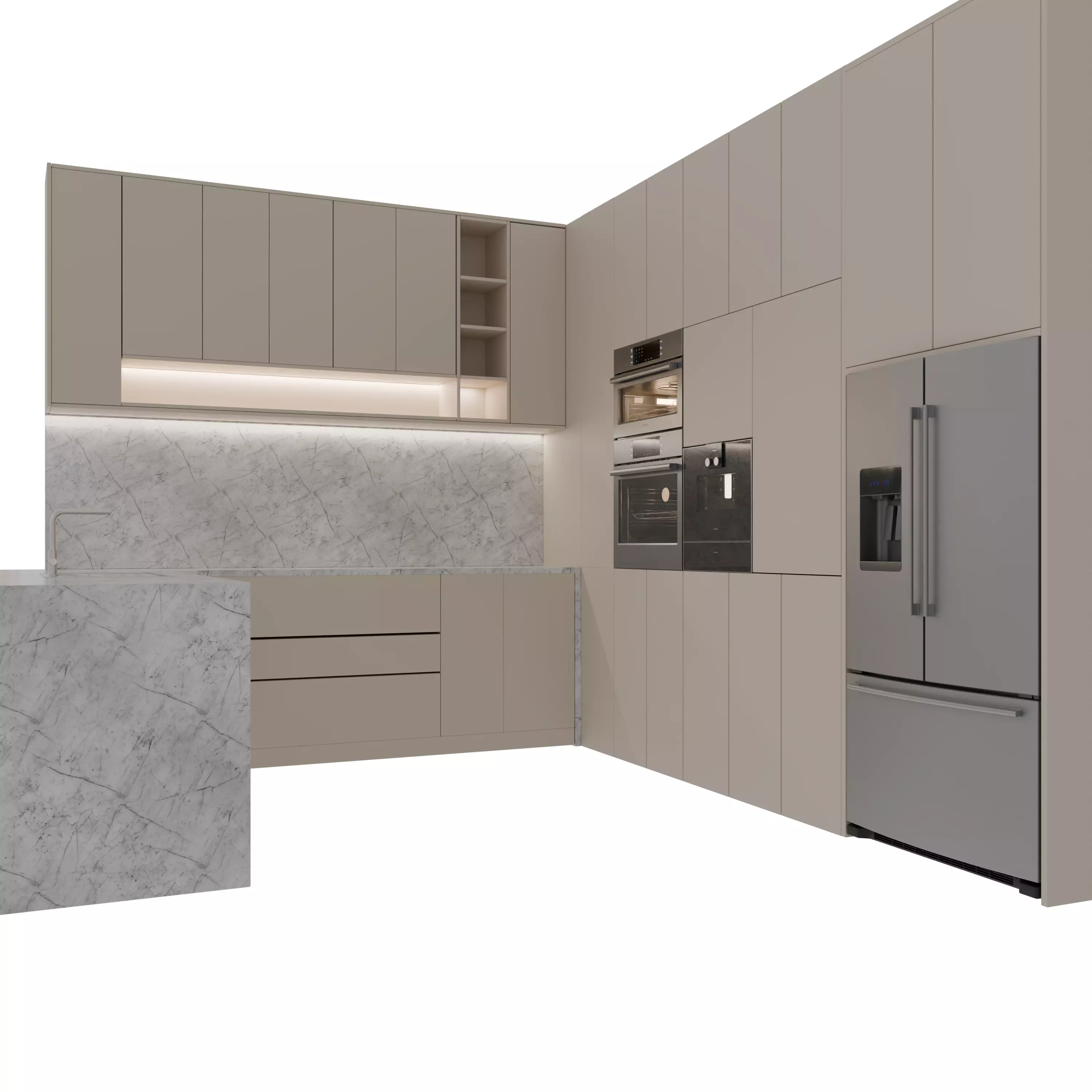 Premium minimalist L-shaped kitchen 3D model designed for high-end architectural visualization and modern interior projects.This model features a soft beige matte cabinetry system, integrated built-in appliances, and marble countertops and backsplash, delivering a clean, elegant, and timeless design.