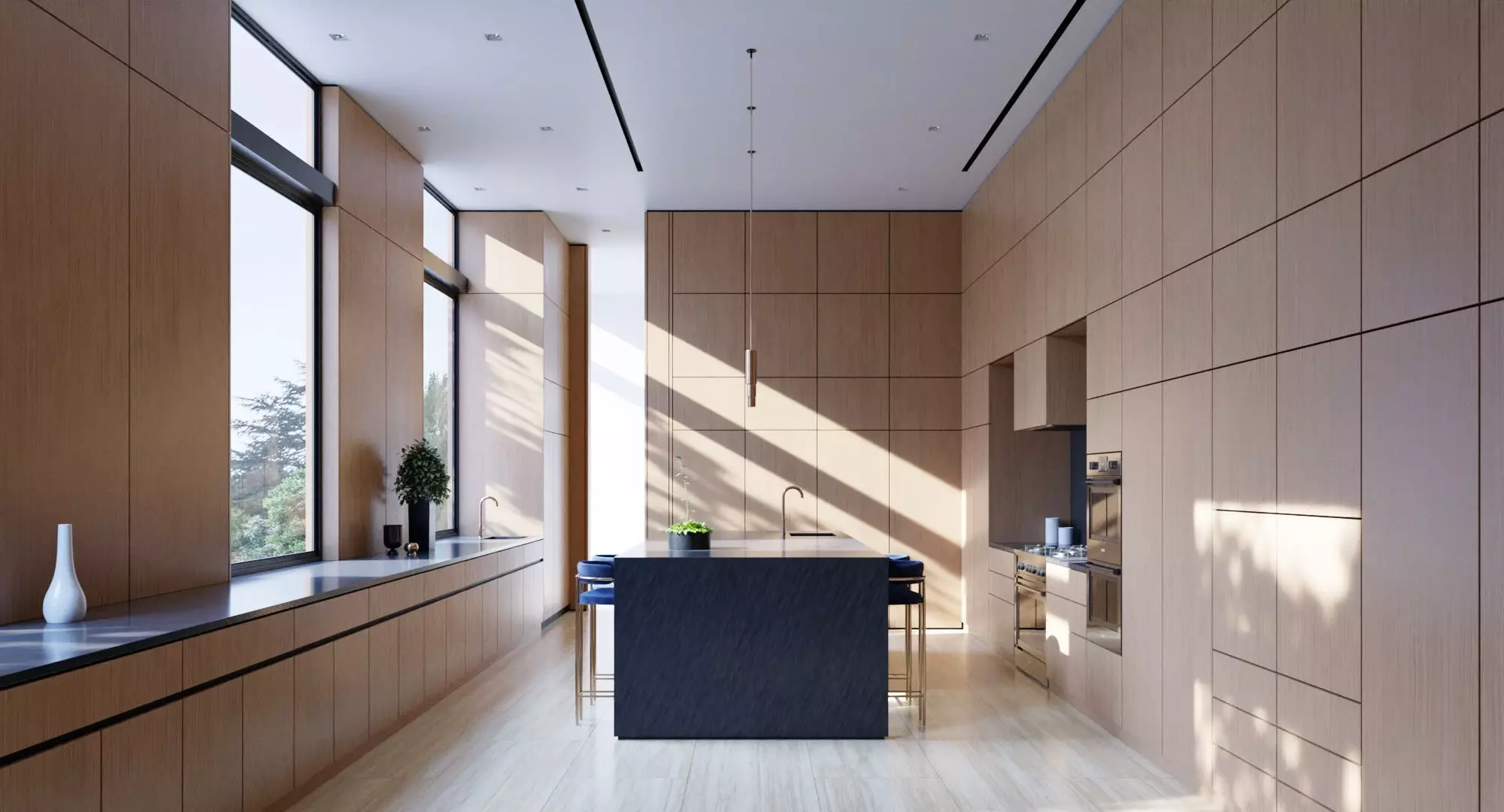 Stool , 2 plants , ovens , cooker ,pendant lights , vases , sink and kitchen tap.