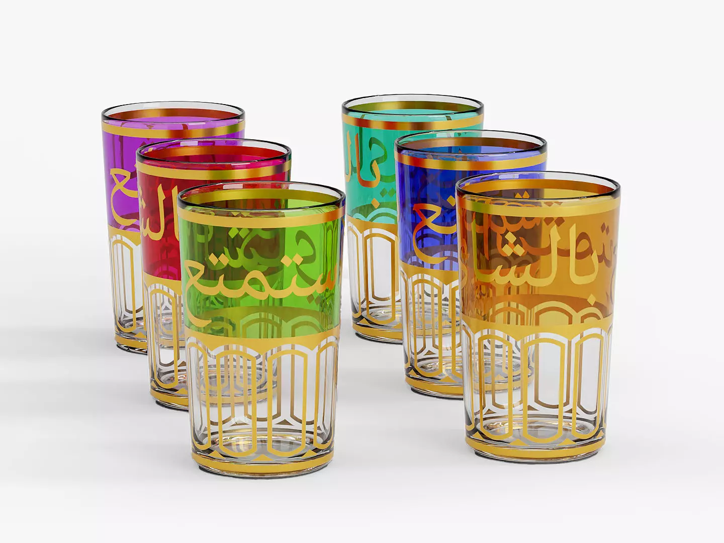 This 3D model features a beautifully detailed set of Colored Moroccan Teaglasses, inspired by modern North African design. Each glass showcases vibrant, translucent colors with Arabic text, ideal for authentic cultural renders, product visualizations, or interior scenes with a touch of exotic elegance.
