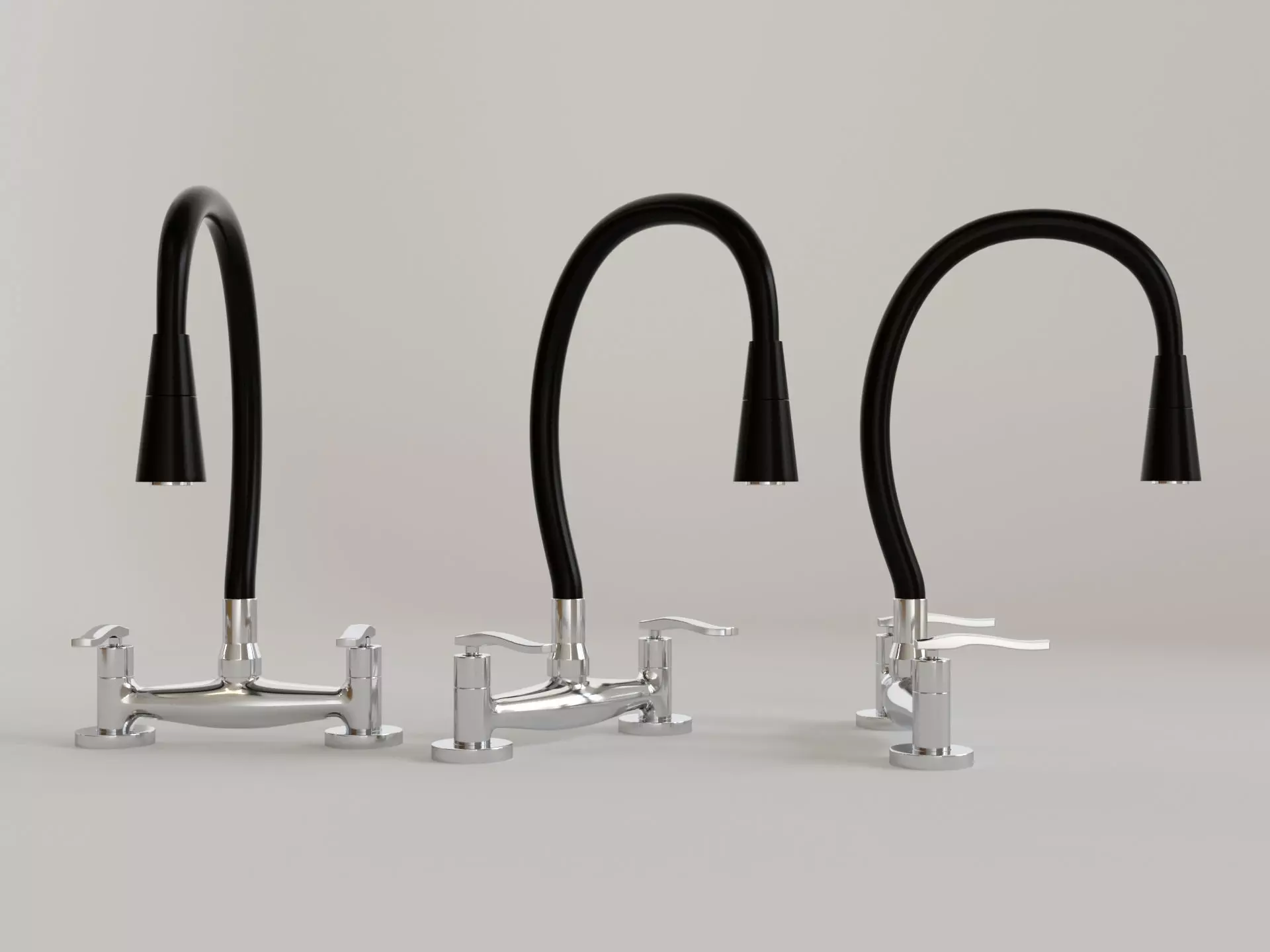 Professional 3D model of a contemporary dual-handle kitchen faucet featuring a flexible black silicone neck and a polished chrome base. This high-poly model is designed for photorealistic architectural visualization, providing a perfect blend of industrial functionality and modern style.
