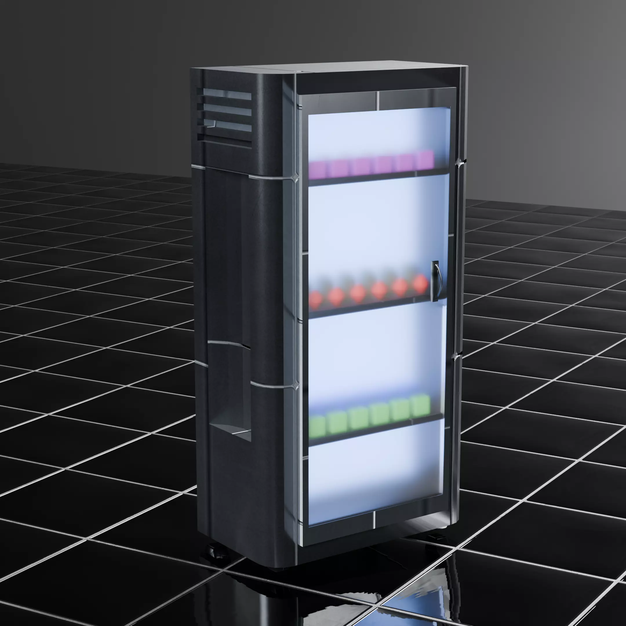 This 3D model represents a modern industrial refrigerator with a high level of detail, featuring a textured and UV-unwrapped design for realistic rendering. The exterior is covered with a dark metallic texture, showcasing subtle reflections and scratches that enhance the industrial look. The transparent glass door reveals neatly arranged shelves with colorful bottles—pink at the top, orange in the middle, and green at the bottom—adding vibrancy and realism to the scene. The chrome handle reflects its surroundings convincingly, emphasizing the attention to material accuracy.