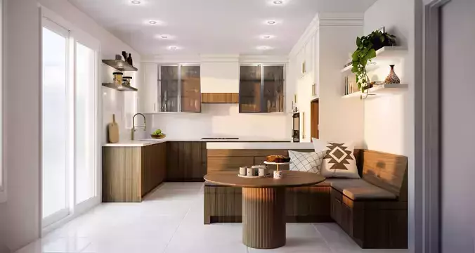 This is a high-quality 3D model of a modern kitchen with a built-in breakfast nook, designed for residential interior scenes. The layout combines elegant cream upper cabinets with rich wood-toned lowers, paired with a fluted round dining table and built-in banquette seating. The design is ideal for use in realistic interior renders, architectural visualization, or animation.