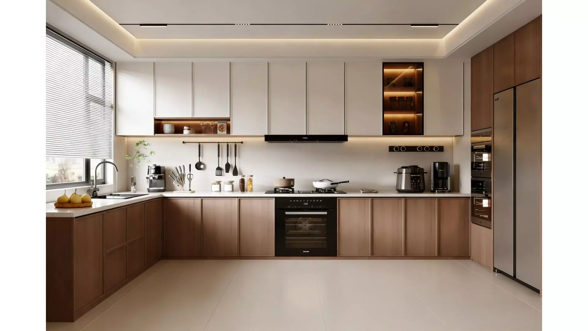 This is an open kitchen that blends modern minimalism with the warm texture of solid wood, featuring an overall color scheme of light tones on the upper cabinets and dark tones on the lower ones. The white wall cabinets and solid wood base cabinets create a distinct layered visual effect.The main-light-free design uses recessed light strips and magnetic track lights to cast a soft, even glow throughout the space, accented by warm lighting from partial open shelving – a touch that elevates the space’s sense of sophistication and coziness.The L-shaped cabinet layout maximizes space utilization, with built-in appliances such as the oven and range hood seamlessly integrated into the cabinetry for a neat, cohesive visual look. Large-area shutters let in ample natural light, while the light beige floors and walls further enhance the space’s airiness and brightness.Balancing practical cooking needs with aesthetic design, the overall scheme uses minimalist lines, natural materials and delicate lighting to craft a modern kitchen and dining area that exudes both a premium feel and a soothing, restorative ambiance.