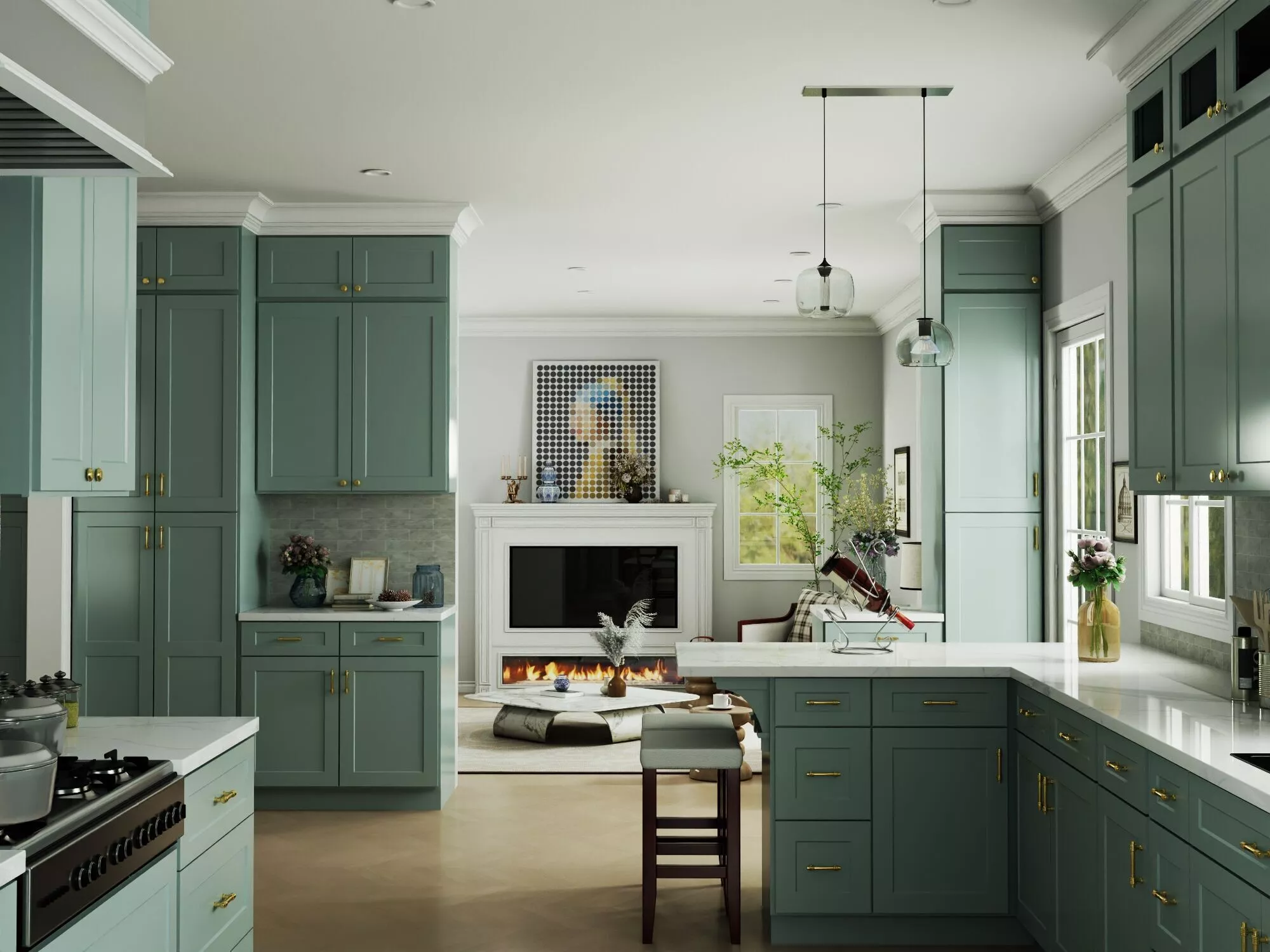 Professional high-quality 3D complete scene of a Modern Transitional Kitchen and Living Room meticulously crafted for high-end residential interior visualization and architectural projects. This comprehensive asset features a sophisticated open-plan environment including custom sage green cabinetry with gold hardware premium marble countertops a functional kitchen island integrated fireplace with a marble coffee table and elegant pendant lighting for a luxurious residential atmosphere.