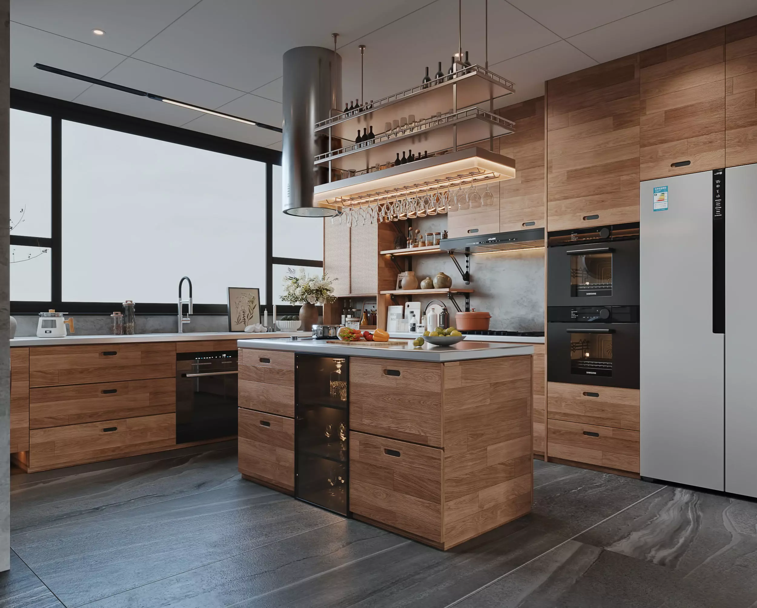 Modern Wooden Kitchen with Island and Built-in Appliances 3D model