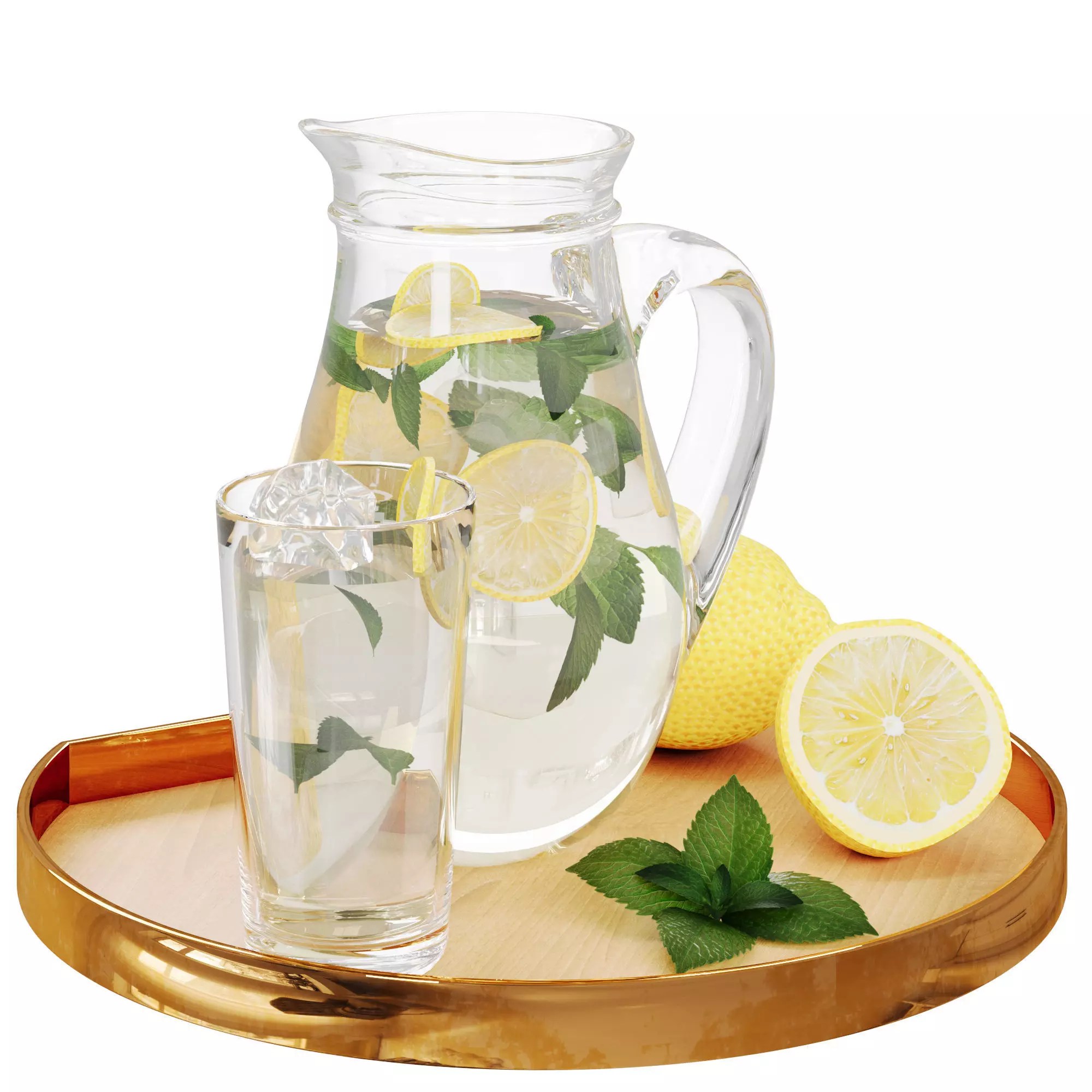 High-quality 3D model of a refreshing lemonade-set, featuring a glass pitcher, a matching glass, and fresh lemons on a stylish golden-tray.