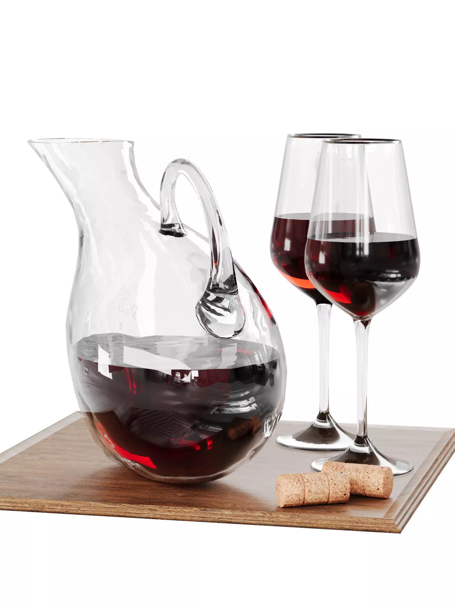High‑quality 3D model of a premium wine‑set featuring an elegant glass decanter, two wine‑glasses filled with red wine, and realistic wine‑corks placed on a classic wooden stand.This set is designed for photorealistic restaurant visualizations, high‑end kitchen interiors, product advertising, and premium still‑life scenes.The model includes clean quad‑based geometry, realistic glass refraction, physically accurate liquid volume, and detailed cork materials.All elements are modeled in real‑world scale and optimized for any PBR‑workflow.Main Features
