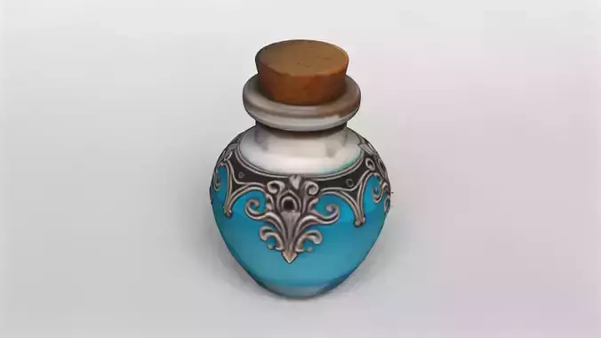 This highly detailed 3D model features an elegant glass potion bottle filled with a vibrant blue liquid. The bottle is topped with a natural cork stopper, adding a rustic and authentic touch to the design. The glass is rendered with realistic transparency and reflections, capturing the essence of a magical or alchemical container.The bottle is adorned with intricate silver ornamental patterns around its neck and upper body, showcasing exquisite craftsmanship and adding a fantasy or medieval aesthetic. These decorative elements are modeled with fine detail, enhancing the overall visual appeal and making the model suitable for use in games, animations, or virtual environments.The model is fully textured, with high-quality materials applied to both the glass and the metallic decorations. The blue liquid inside has a subtle glow effect, contributing to the mystical vibe of the asset. The cork stopper texture is detailed, showing natural wood grain and imperfections for added realism.This 3D asset is available for download in GMB format, including all textures for immediate use. Additionally, it is provided in FBX format, ensuring compatibility with a wide range of 3D software and game engines. Whether for fantasy projects, RPG games, or visual storytelling, this potion bottle model is a versatile and visually striking addition to your asset library.