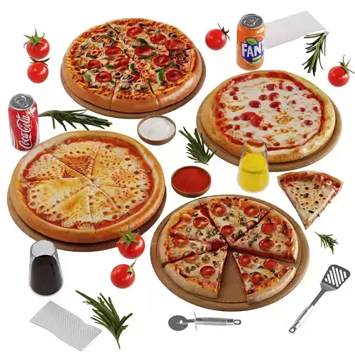 Pizza Set 1:2 Margherita and Slice1 Supreme1 PepperoniDrink CansDishes Fbx and objMax version is 2018vray and coronablender cycles