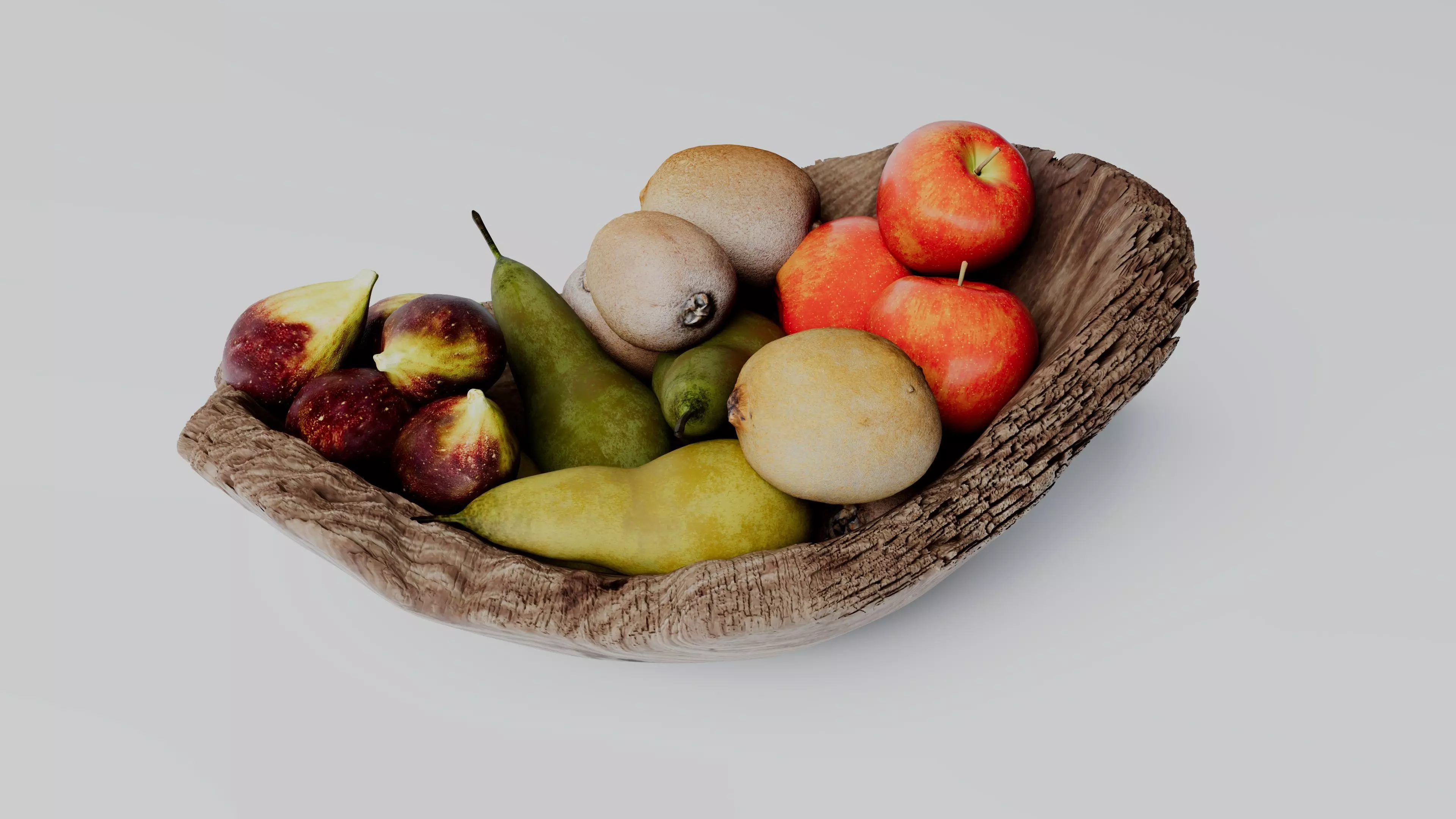 This professional-quality 3D model features a rustic wooden fruit plate inspired by natural tree bark, carefully filled with realistic fruits including fig, kiwi, pear, and apple.