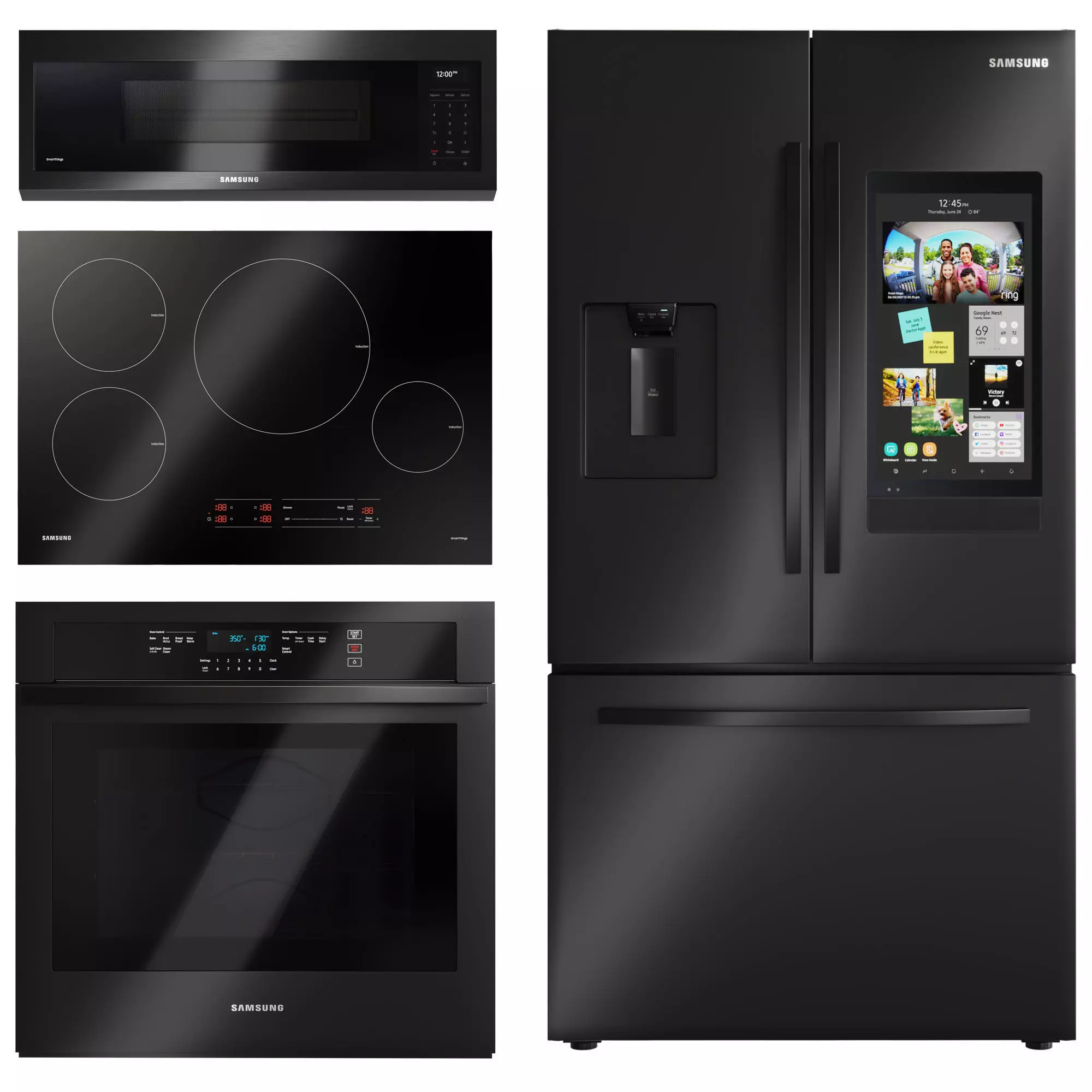 Refrigerator:https://www.samsung.com/us/home-appliances/refrigerators/3-door-french-door/26-5-cu--ft--large-capacity-3-door-french-door-refrigerator- with-family-hub--and-external-water---ice-dispenser-in-black-stainless-steel-rf27t5501sg-aa/Cooktop:https://www.samsung.com/us/home-appliances/cooktops-and-hoods/induction-cooktops/30--smart-induction-cooktop-with-wi-fi-in-black-nz30a3060uk-aa/ wall-ovenhttps://www.samsung.com/us/home-appliances/wall-ovens/single/30-single-wall-oven-in-black-stainless-steel-nv51t5511sg-aa/ Microwavehttps://www.samsung.com/us/home-appliances/microwaves/over-the-range/1-1-cu--ft--smart-slim-over-the-range-microwave-with-550- cfm-hood-ventilation--wi-fi---voice-control-in-black-stainless-steel-me11a7710dg-aa/