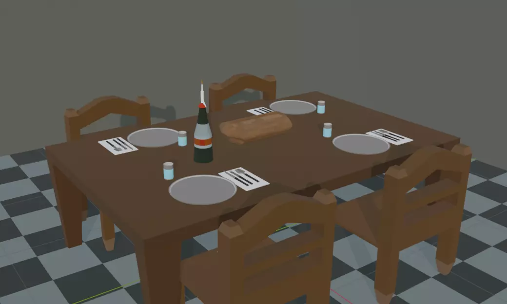 The set includes a wooden dining table surrounded by matching chairs and fully dressed with tableware, making it ideal for taverns, houses, inns, or castle interiors. Designed with a clean, readable low-poly style that fits well in both indie and mobile-friendly projects while still looking great in modern engines.