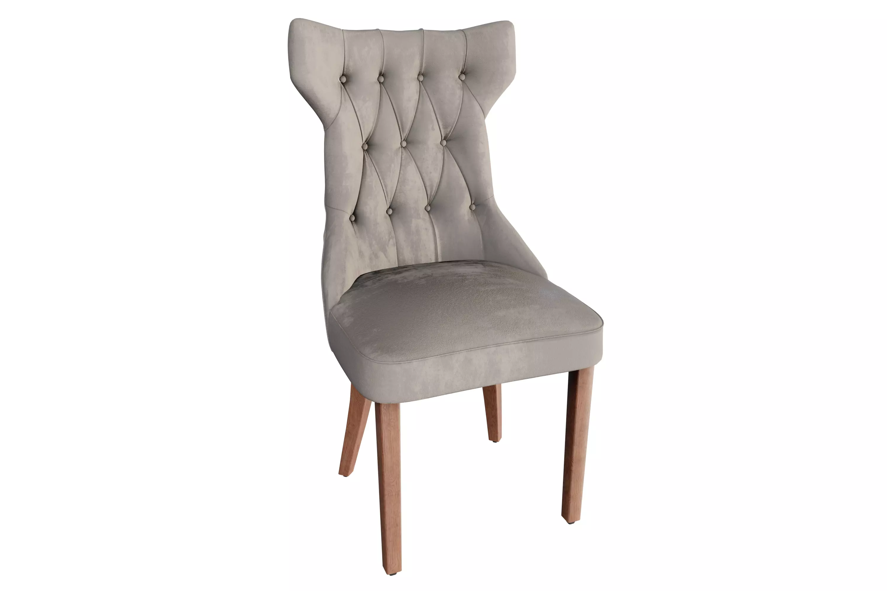 This is a detailed PBR (Physically Based Rendering) 3D model of a stylish tufted dining chair. The chair features a high back with diamond-patterned tufting and button accents, a comfortable upholstered seat, and four slender wooden legs. This elegant design is perfect for dining rooms, living areas, and sophisticated interior visualizations.