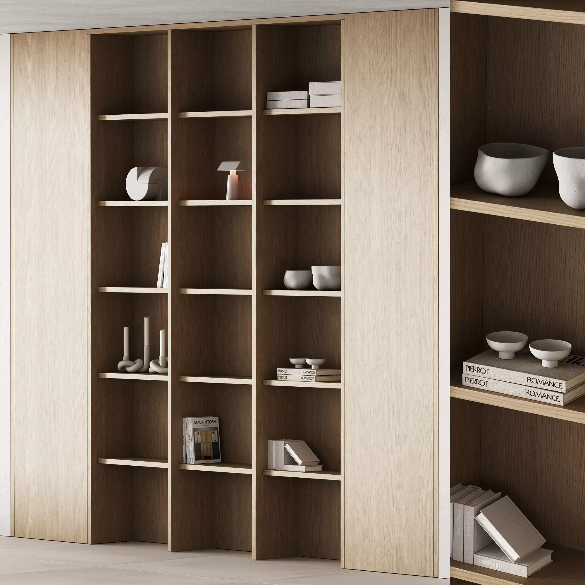 3d model: built-in / modular / wall rack / book shelf filled with decor.Table lamp &tradition Caret MF1 Matteo Fogale table lamp portableCandle and candle holder CB2 Asha White Knotted Double Taper Candle Holder, CB2 Asha Speckled Cement Knotted Taper Candle HolderAlumina Tealight CandleholderFredericia Leather Box By August SandgrenVases, books, decorative sculptureAll books are made in original sizes, which can be found and purchased on Amazon. The names are indicated inside (in the names of objects and materials)