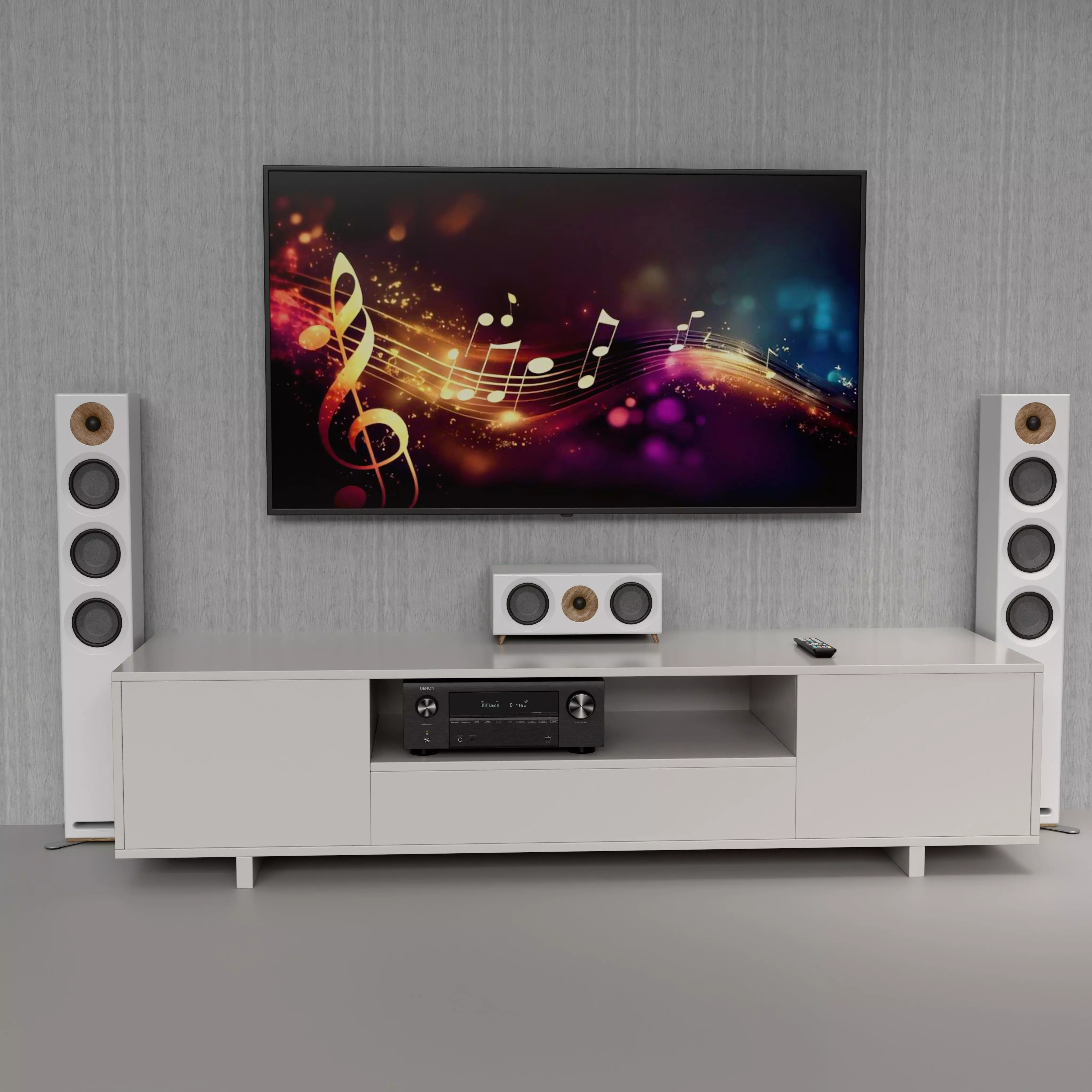 A modern home-entertainment 3D model set featuring a wall-mounted TV, floor-standing speakers, a center speaker, and a minimalist TV cabinet. The model is created in Blender with a low-poly, web-optimized topology. All UVs are manually unwrapped and efficiently packed for the highest texture quality. Textures are crafted in Substance Painter, delivering realistic surface detail and excellent visual fidelity in any 3D viewer.This product is provided in multiple formats — FBX, OBJ, GLB, and Blender — making it easy to use in advertising visuals, product rendering, game scenes, or web-based 3D applications.