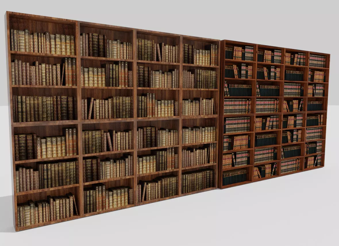 Bookshelves lot, can be re-organised to create a whole library. Perfect for games, renders, animations, VR, etc. Textures include colour, bump, spec, and roughness.