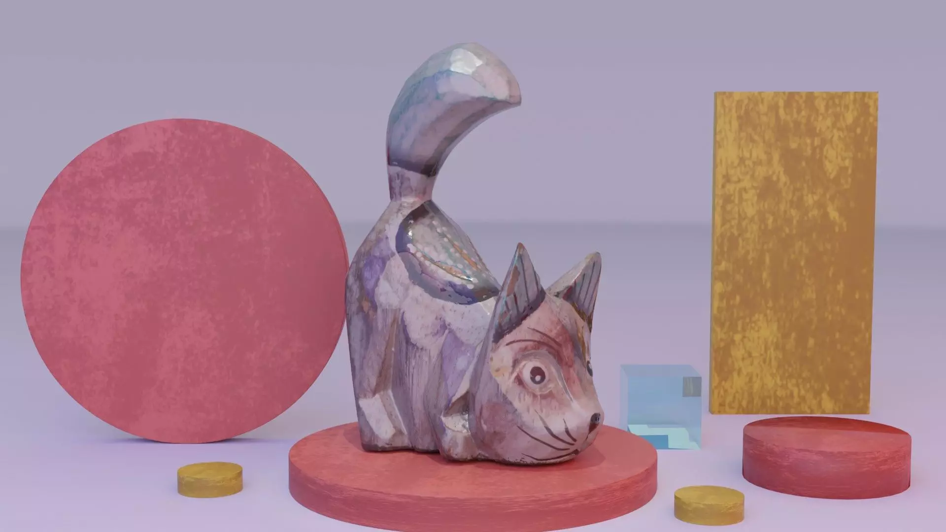 This is a photorealistic high-poly 3D model of the handmade cat wood statuette.