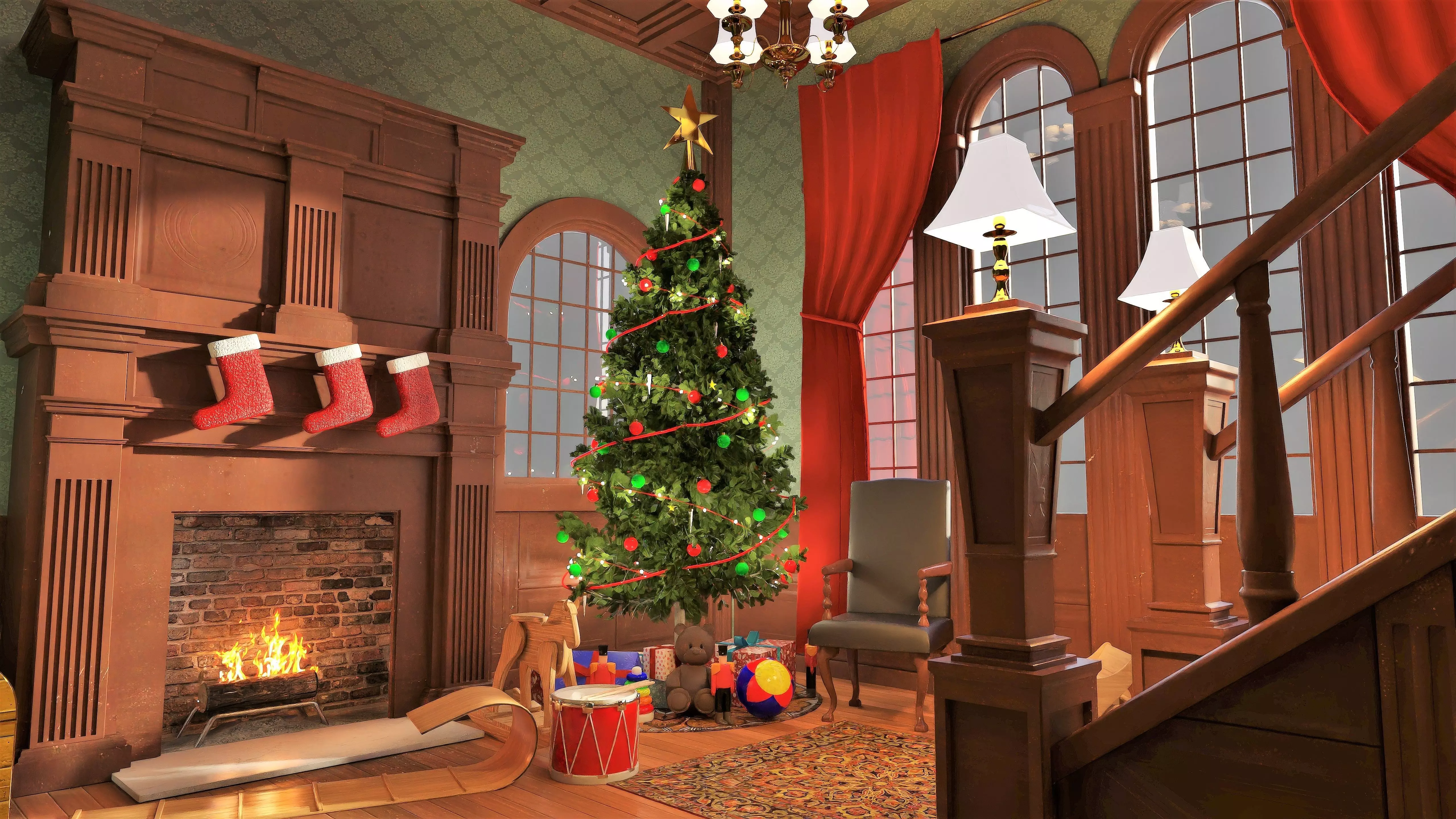 Wall Christmas Tree Floor Ceiling Random Gift Boxes Wall Hall Rug Round RugChristmas Sock Chair Rocker Ducky Snow Sled Toy Soldier Rubber Ball Drum Stick Drum TeddyStacked TorusCR Chandelier Wall Chandelier Christmas Sock Toy Soldier Wall Stair Drapes