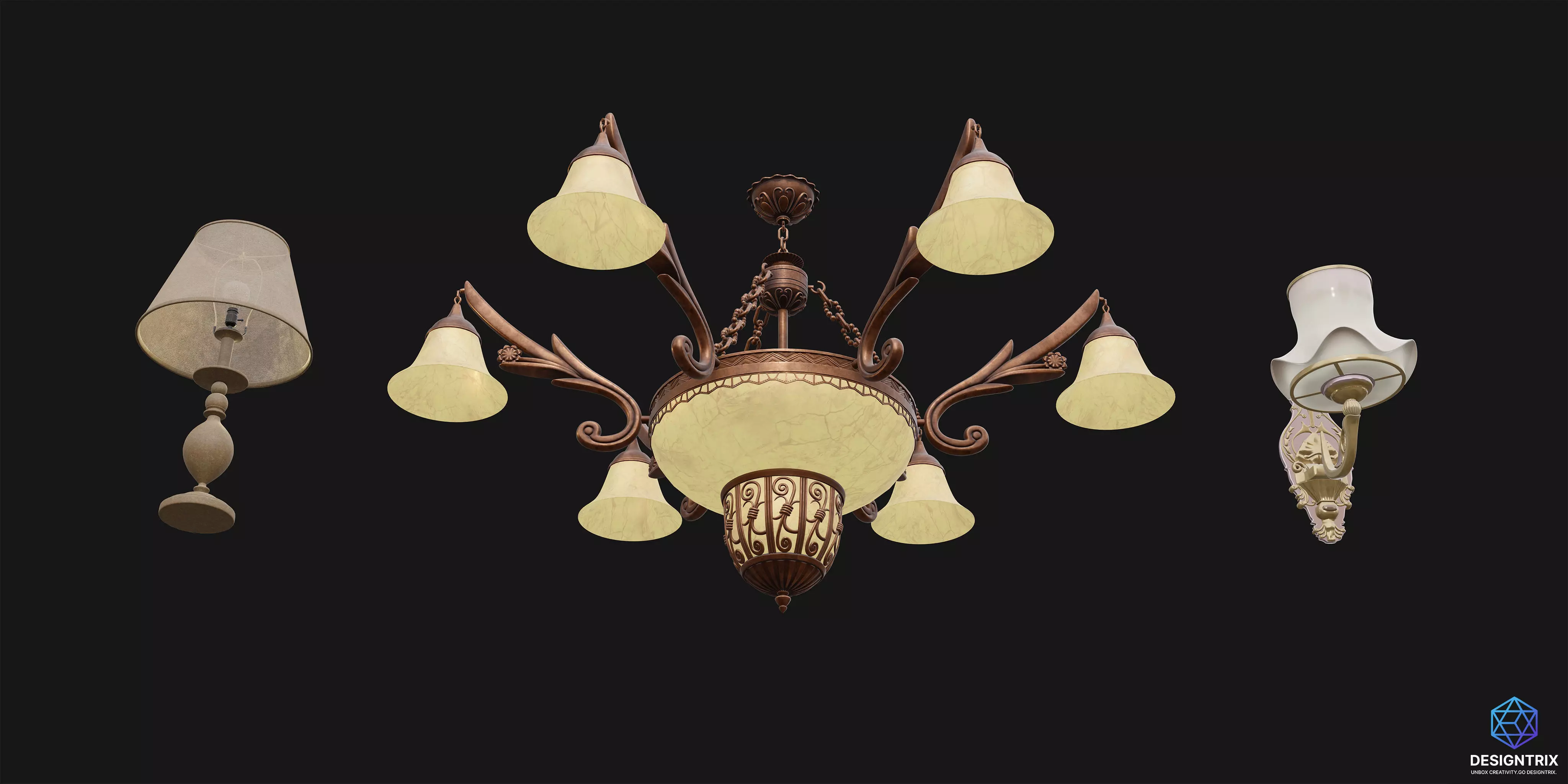 Elevate your scenes with this elegant Vintage Lighting Collection, featuring three unique and highly detailed 3D light fixtures: a classic table lamp, a grand chandelier, and a wall-mounted sconce. Each piece is designed with realism and historical charm in mind,making them perfect for vintage, Victorian, or classical-style interiors.