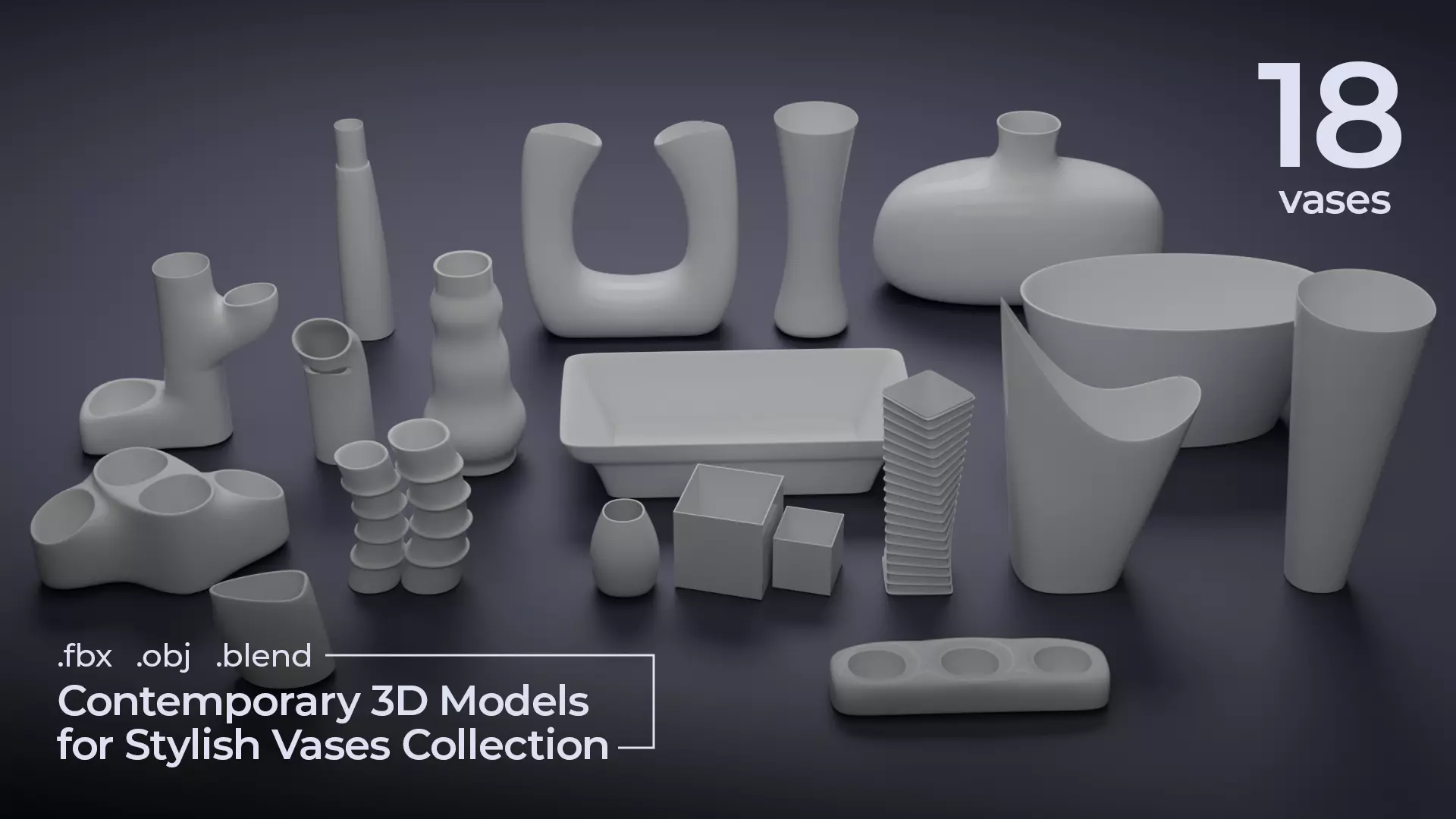Elevate your modern interior scenes with the elegant **Modern Vase Set**, featuring 18 unique vase variations. Meticulously crafted using a blender, they add the perfect finishing touch to contemporary spaces.