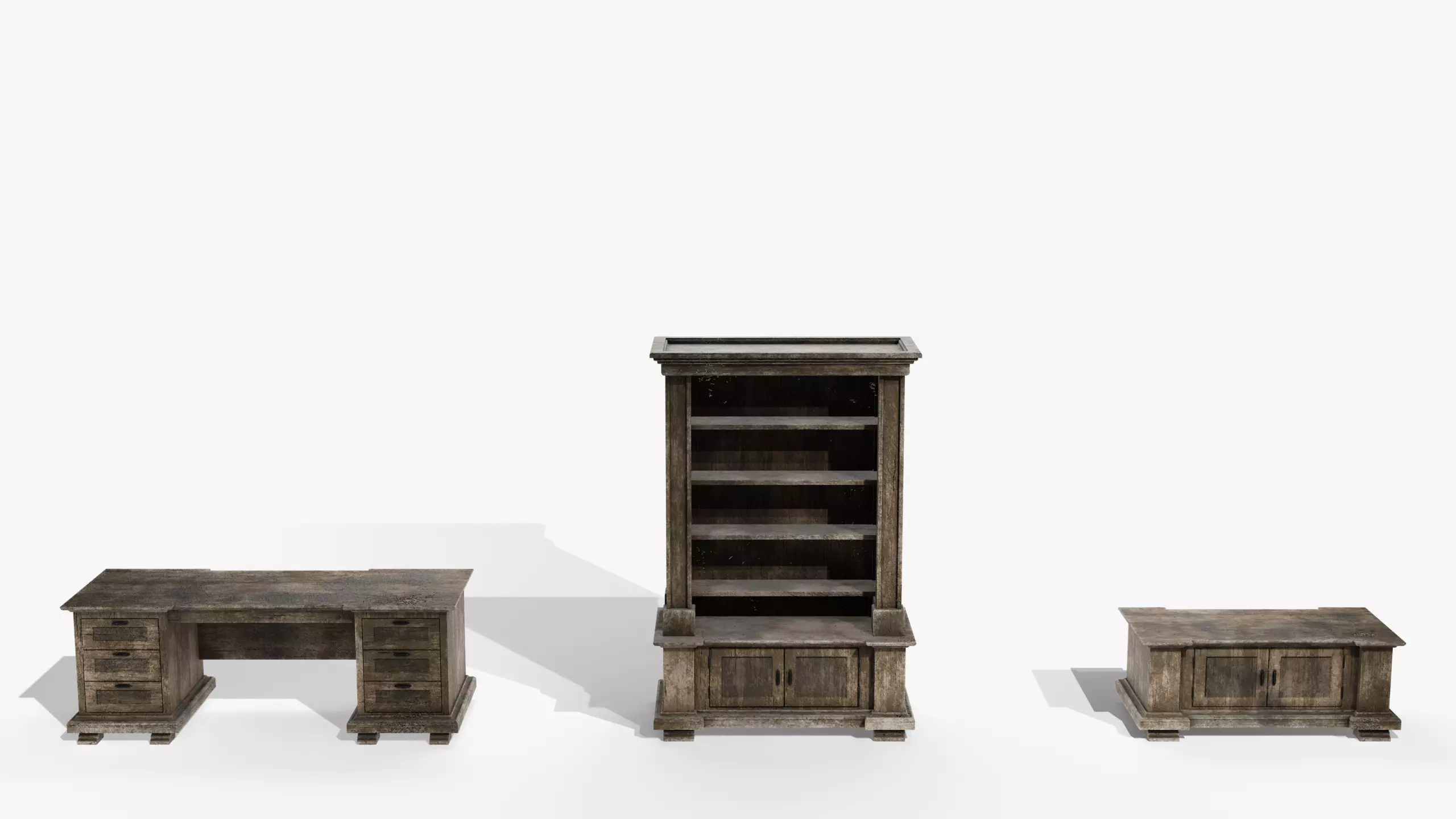 The set consists of a Desk, Bookcase, and Sideboard, in an old, worn, broken, or distressed state, such as those you may find in a survival horror or post apocalyptic type setting.