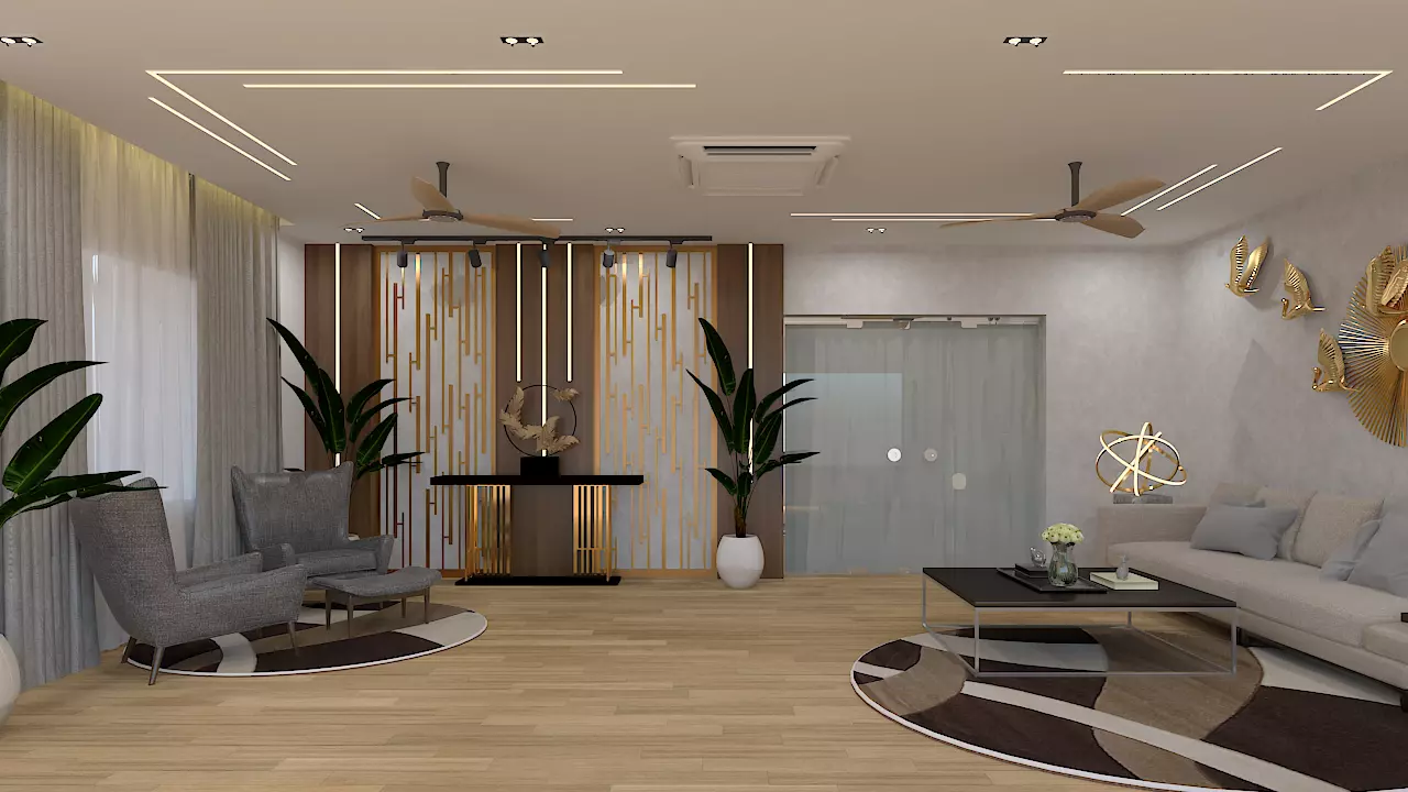 The view from outside the house, the front elevation, the materials utilised, the depth of the gold finish, the incorporation of nature inside, and the accentuation of the entrance mesmerised me. This is simply not the case; when entering the area, you immediately notice the grandeur. The interiors are a wonderful blend of modern, fashionable, and contemporary. All of the sections are finished with high-quality materials, including the paint, ceiling, flooring, and material finishes.Regarding the wall that faces the entrance, it has a perfectly crafted Metal CNC cut that is backed by wooden wall panelling with running profile design and grey texture paint. Even more highlighting is the artefact that is displayed on a gorgeously crafted console table with gold finish, which gives the room a completely royal feel. #cgtp-15 #p-52