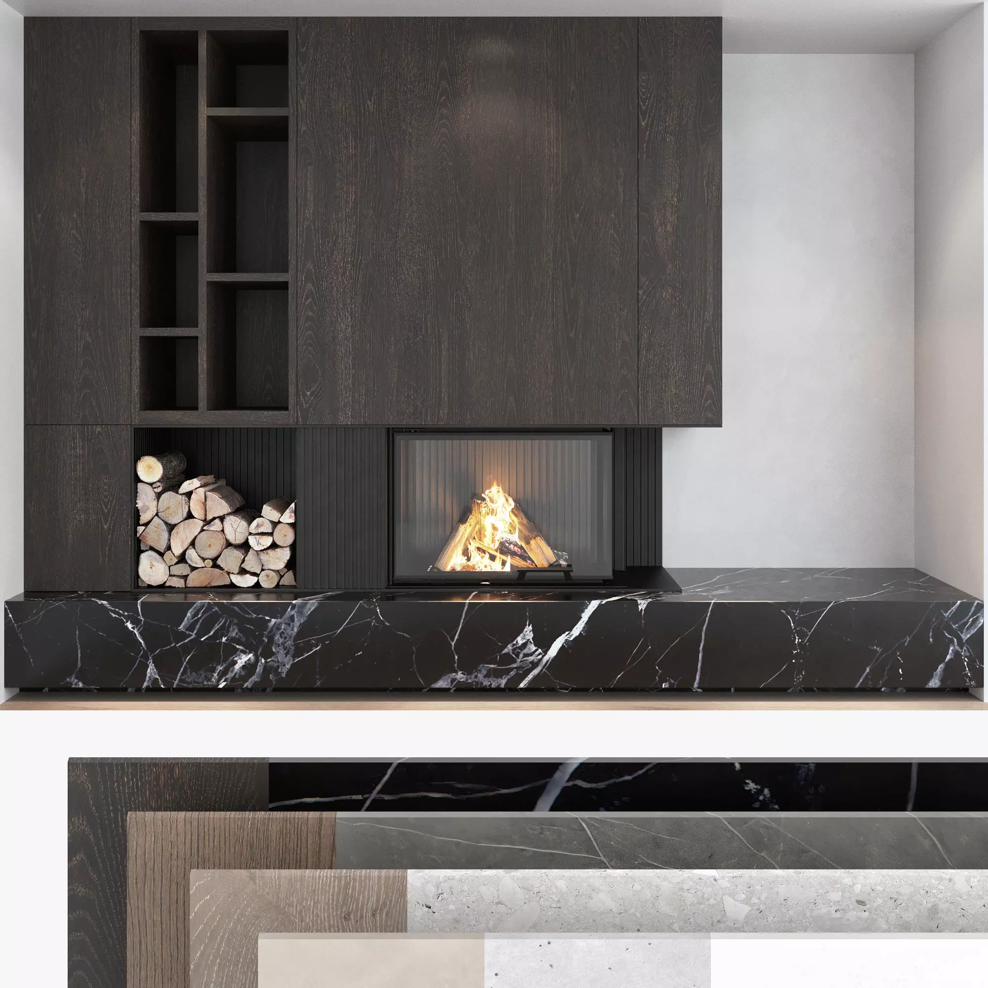 4 types of configuration3 sizes of Romotop IMPRESSION fireplaces, firewood (high quality textures, resolution 7000x7000 pixels)Materials: concrete, terrazzo, 2 marbles, 2 decorative plasters, 3 wood materials (high resolution seamless textures)Overall dimension: W.3500mm x H.2500mm x D.850mm