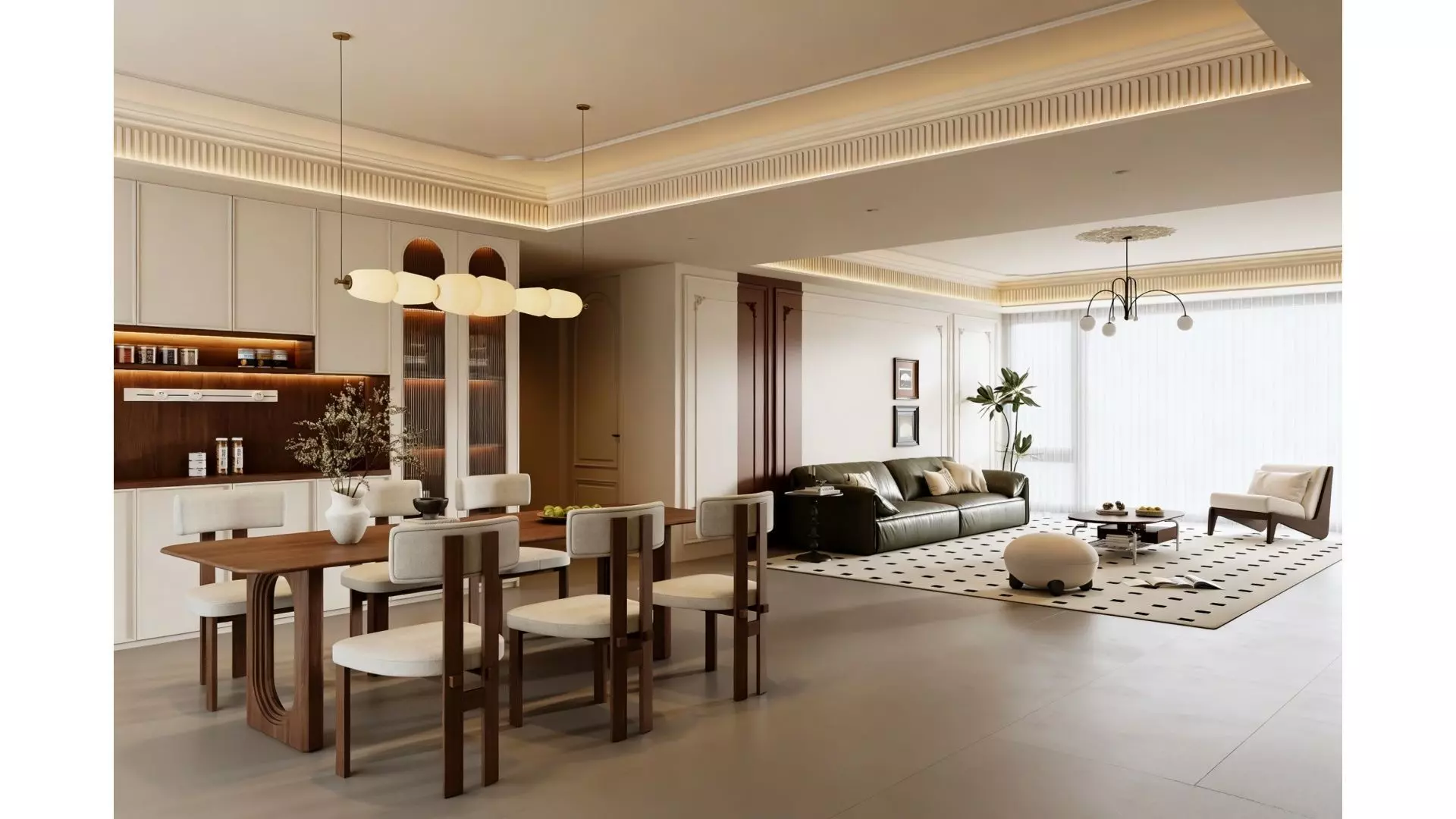 This is an open-concept living and dining space designed in a French light luxury style with a cream color palette as the base, boasting a warm and soothing overall atmosphere that blends elegant texture with a sense of comfortable relaxation. For the dining area, a walnut dining table is paired with light beige dining chairs, and a cloud-shaped chandelier overhead adds a soft, warm glow; the sideboard features a combination of wood veneer and white cabinetry, with built-in light strips elevating the sophisticated feel. The living area centers on a dark green leather sofa, matched with a polka-dot rug and rounded accent chairs, showcasing minimalist lines with a retro touch. The gypsum line moldings on the ceiling and the recessed main light-free lighting design enhance the layered sense of French elegance. Through the delicate coordination of materials and colors throughout the space, a modern light luxury living experience suitable for a large flat is created.