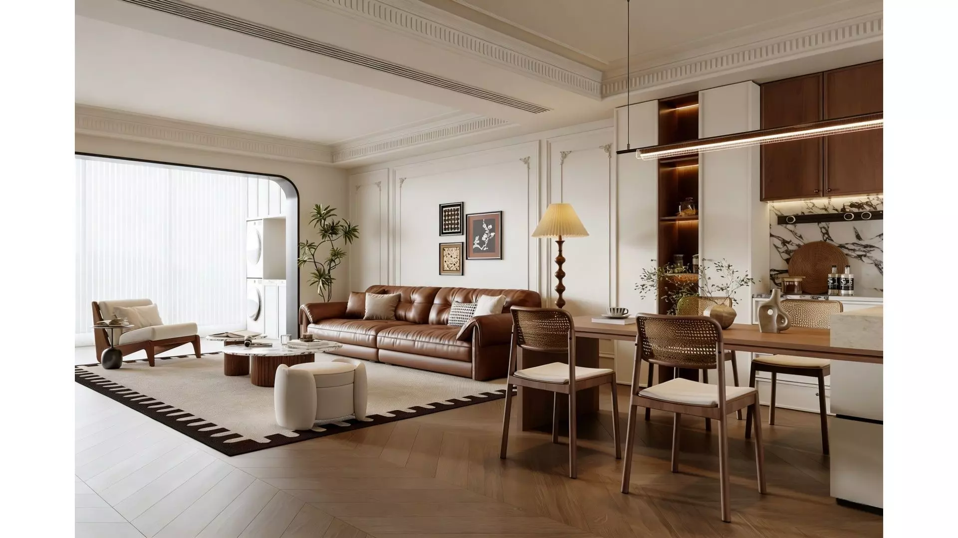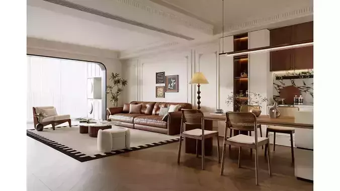 This is an open living and dining space that blends French romance with mid-century texture, featuring a soft cream white and warm dark brown as the main color palette to create an elegant and soothing home atmosphere.In the living area, a caramel-colored vintage genuine leather sofa is paired with casual chairs with rattan and wooden elements, exuding a strong retro charm against the herringbone parquet floor and a carpet with black geometric borders; the exquisite gypsum line moldings and artistic wall paintings on the walls echo the layered ceiling design overhead.The open dining and kitchen area continues the overall style: rattan dining chairs and a wooden dining table bring a natural and simple tactile feel, while the minimalist linear chandelier and gentle soft furnishings infuse the space with a sense of ease amid elegance.Large-area vertical grain glass sliding doors ensure ample natural light and enhance the spatial transparency. The overall design perfectly integrates retro aesthetics with modern comfortable living, crafting an ideal residence that is both warm and stylish.