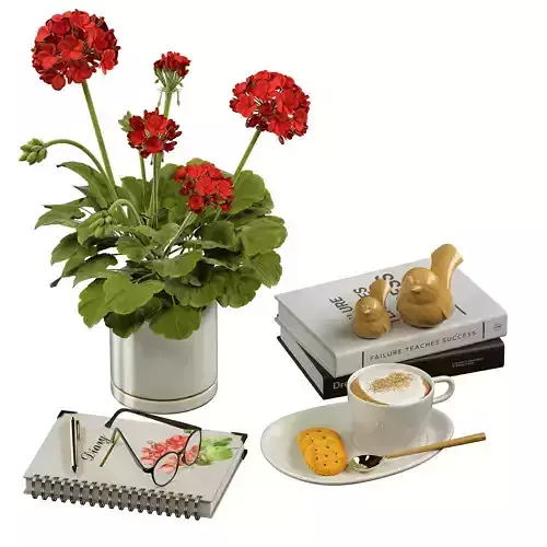 Title:3D Decorative Table Model with Geranium Plant, Books, and CoffeeDescription:This high-detail 3D model showcases a beautifully decorated table featuring a stunning red geranium plant in a sleek pot, an inspiring stack of books, a personal diary with a pen and glasses, and a creamy cup of coffee served with biscuits on an elegant plate. Additionally, two wooden bird sculptures add a touch of warmth and nature to the scene.This model is perfect for realistic rendering, interior design, architectural visualization, and advertising projects. Every element is carefully modeled with high-quality materials to enhance realism.Features:Highly detailed and realistic modelingHigh-quality materials and professional textures Ideal for interior design, architecture, and advertising projectsCompatible with various rendering enginesAvailable Formats:( OBJ and MAX formats)Perfect for: Interior designers and architectsAdvertising and visualization projects3D artists and CG professionalsThis model is an excellent choice to bring warmth and life to your digital scenes!