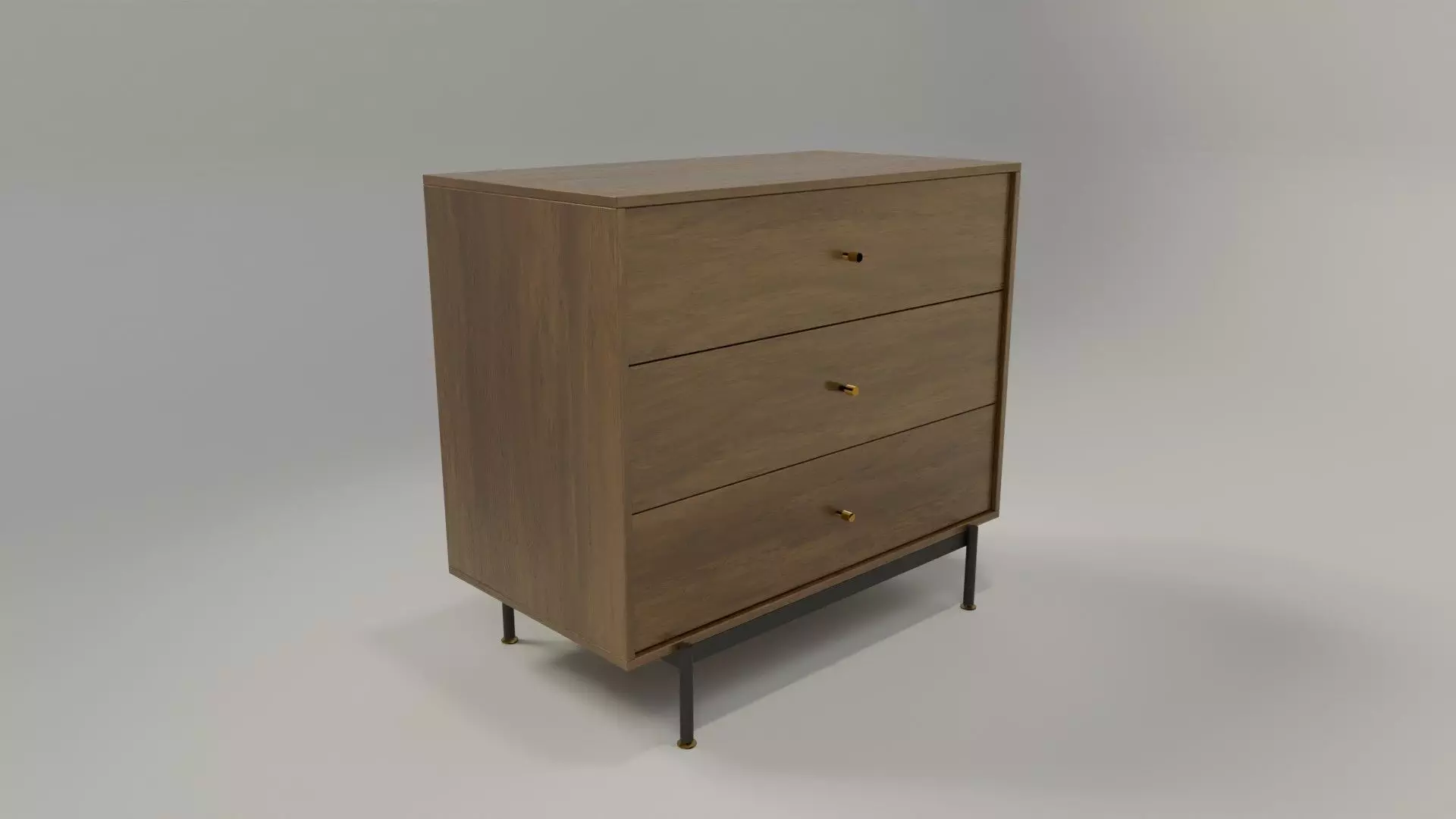 Mid-century inspired Chest of 3 drawers with warm walnut veneer finish, black metal legs, brass-look knobs, and smooth-gliding drawers. Ideal for bedrooms, living rooms, or as a side table. Real-world scale, clean topology, PBR textures (4K), multiple material variations available. 90x48x81 cm