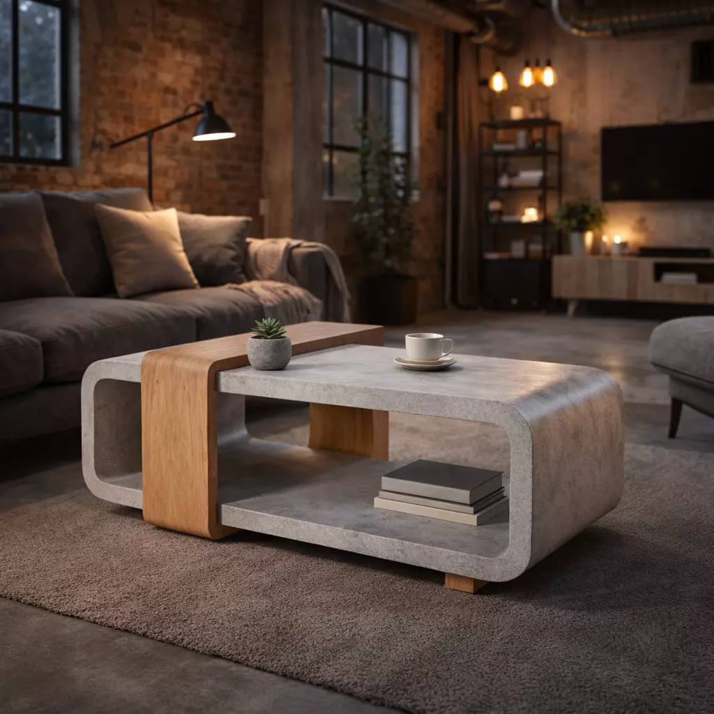 Elevate your interior scene with this contemporary sculptural coffee table that blends raw concrete aesthetics with warm natural oak. Designed with a seamless flowing form, the table features two hollow U-shaped concrete volumes intersected by a smooth solid oak frame, creating a striking balance between industrial strength and organic warmth.
