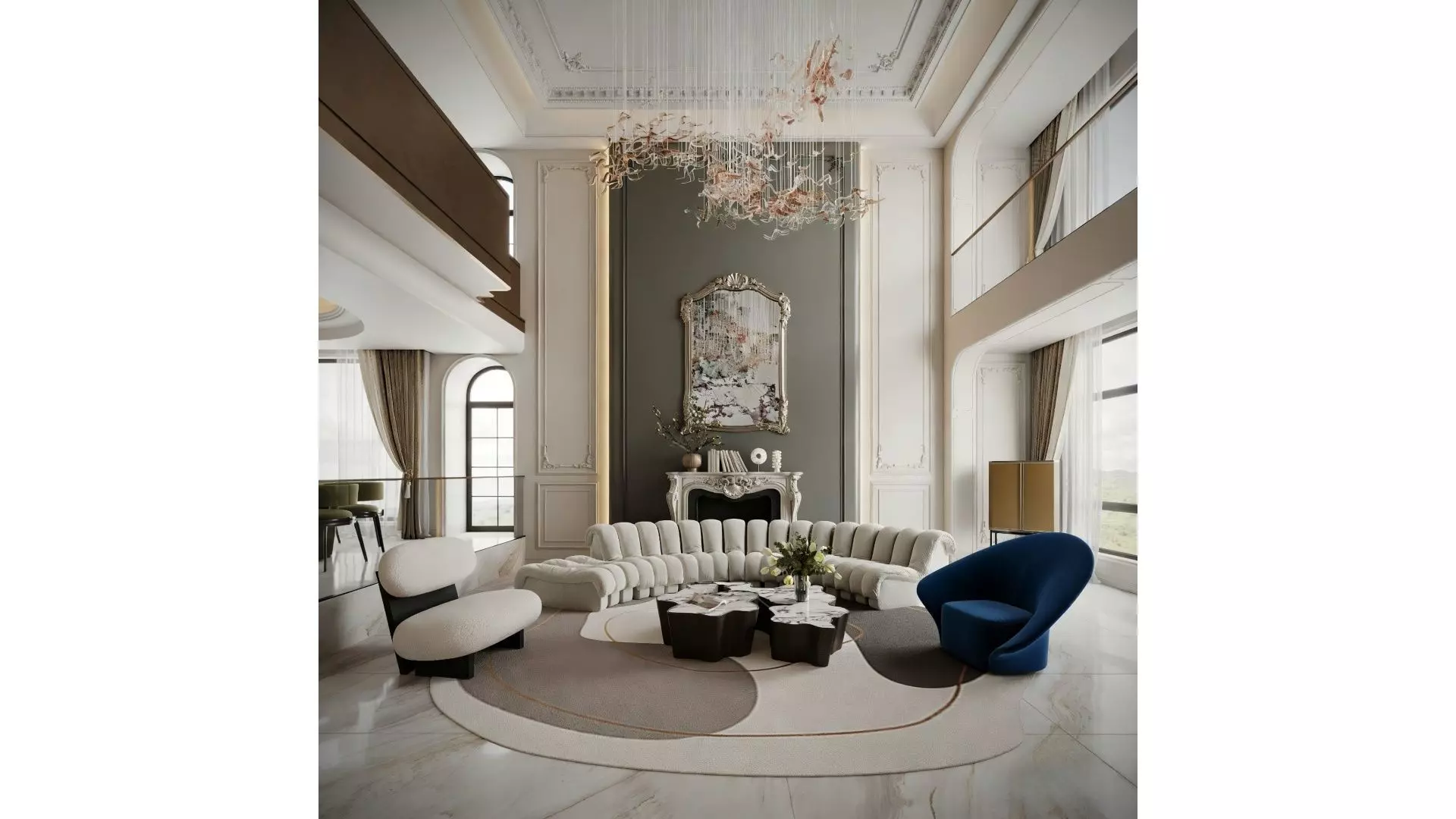 This is a double-height living room in a duplex villa, designed with a fusion of French luxury and modern styles. The space features a color palette dominated by off-white, light gray, and deep green, complemented by gold accents and a marble floor, creating an elegant and sophisticated atmosphere.At the center is a uniquely shaped cream-colored modular sofa, paired with a dark brown irregular coffee table. On either side sit a white shearling armchair and a sapphire blue artistic armchair, creating a striking visual contrast. The accent wall is deep green, adorned with a vintage carved fireplace and a large-scale artwork, above which hangs a transparent artistic chandelier of great design sensibility. Its cascading lines and fluid form serve as the focal point of the space.The walls are finished with exquisite paneling and carved moldings, paired with arched windows and a double-height structure. This design retains the elegance of French classicism while incorporating the modernity of contemporary furniture, resulting in an overall space that is open, grand, and balances artistic expression with comfort.