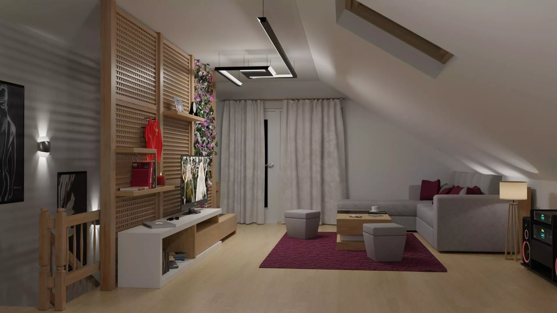 3d scene of a living room created in Blender 2.82Images rendered with Cycles, short animation rendered with EEVEEFiles included : .blend (native) .fbx .obj .abc .ply .usdc