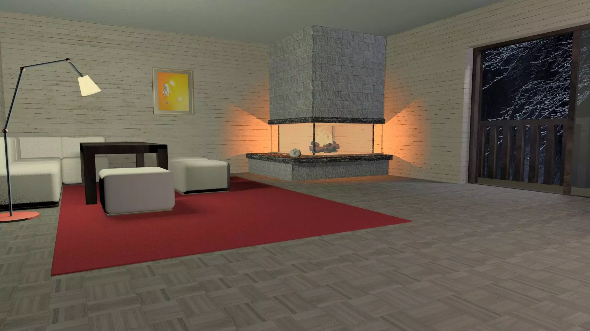 It's a 3ds living room model, very simple. Contains: a sofa, book shelf, coffee table, a chair, chimney and a carpet. All the files with the materials are in one archive.