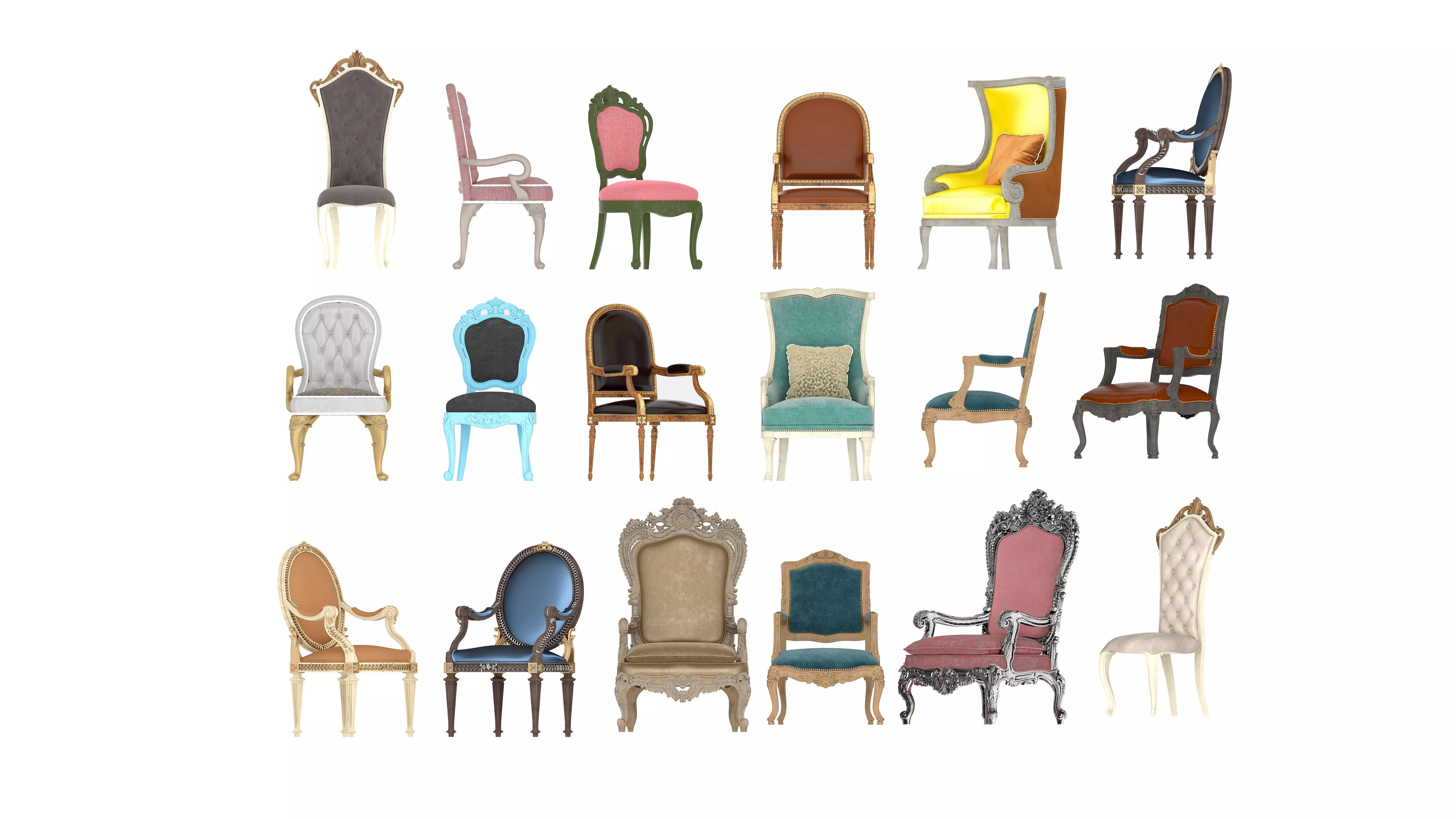 This is a premium collection of classic European / antique style chairs, inspired by French, Baroque, and luxury interior furniture designs.The pack includes multiple unique chair models with rich details, suitable for both close-up renders and full interior scenes.