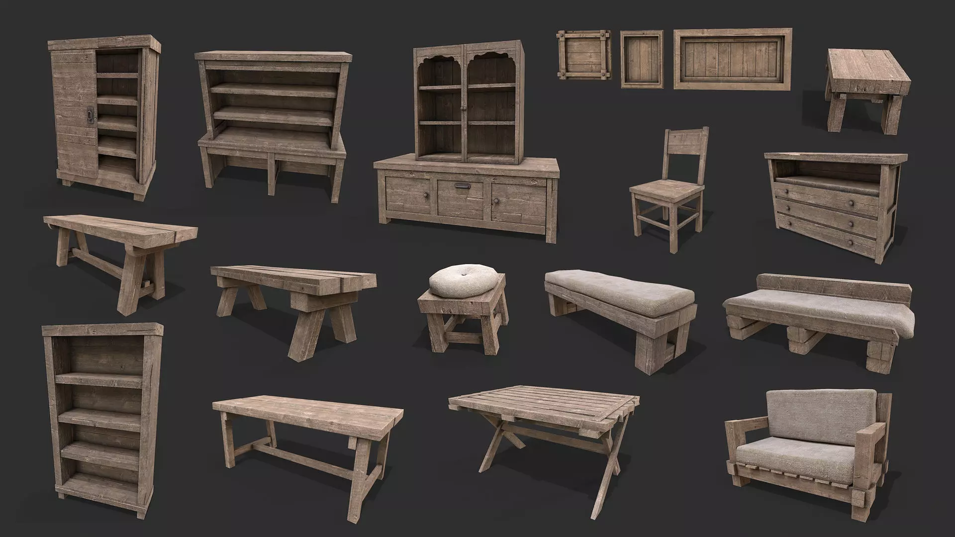The Living Room Furniture Pack contains medieval-style furniture suitable for living rooms, noble halls, castles, and village interiors. The pack includes benches, cabinets, chairs, tables, consoles, stools, and picture frames designed to create realistic and immersive medieval interiors.These models are optimized and suitable for real-time applications while maintaining high visual quality.