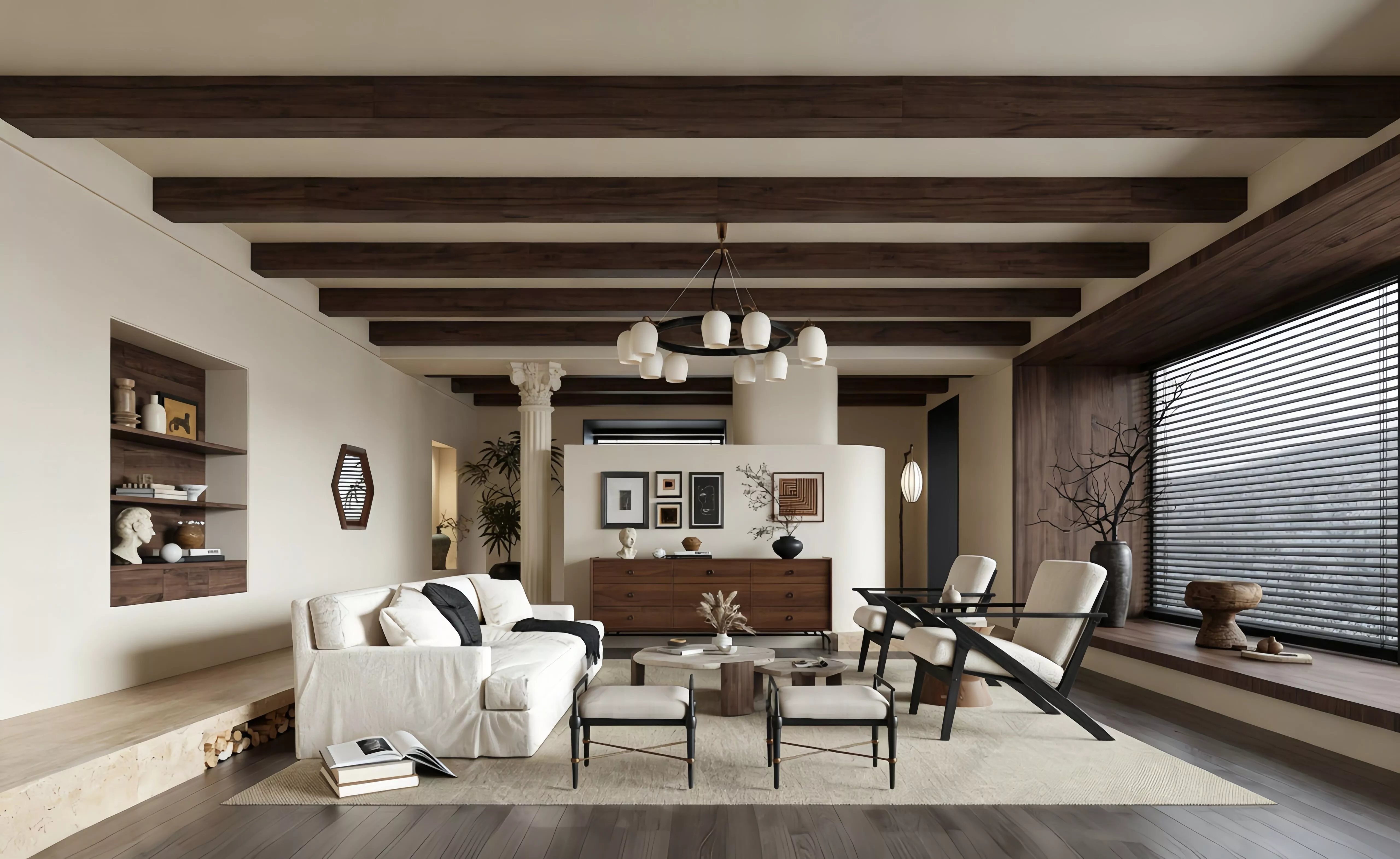 This is a spacious open-plan living room that blends Mid-Century Modern and Wabi-Sabi aesthetics. The overall space is anchored in warm wood tones and creamy off-white, creating a relaxed, sophisticated, and artistically rich home atmosphere.Structure & Hard FinishesThe ceiling features dark walnut-toned solid wood beams, which enhance the space's retro texture while defining distinct visual layers. Creamy off-white walls are paired with a matching raised platform, and the built-in solid wood niche on the left serves both storage and display functions. The design of the Roman column and curved half-wall infuses the space with a sense of vintage ritual. On the right, a full-wall louvered window lets in soft natural light, complemented by a wooden windowsill that creates a bright, tranquil, and airy feel.Furniture & Soft FurnishingsA creamy off-white fabric sofa is paired with black-framed Mid-Century Modern lounge chairs, forming a cozy, enclosed conversation area. Round solid wood coffee tables and a solid wood dresser echo the overall wood-centric style, boasting minimalist silhouettes with rich vintage details. A circular multi-light chandelier, floor lamp, art prints, and sculptural decor elevate the space's artistic ambiance layer by layer. Dried floral arrangements, greenery, and natural stone elements infuse the room with a sense of organic, living warmth.Style HighlightsThis design masterfully merges vintage elements with modern comfort. Through low-saturation color palettes and the use of natural materials, it creates an ideal living room that balances stunning aesthetics, practical functionality, and immersive atmosphere. Perfect for large spaces like open-plan apartments and villas, it stands as a classic example of Mid-Century Modern home design.