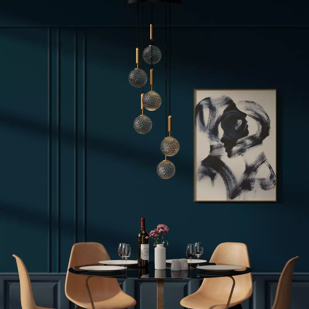 A Minimalistic chandelier from the Nuura lighting collection. The glass shade includes a texture which create intersting shadow light.