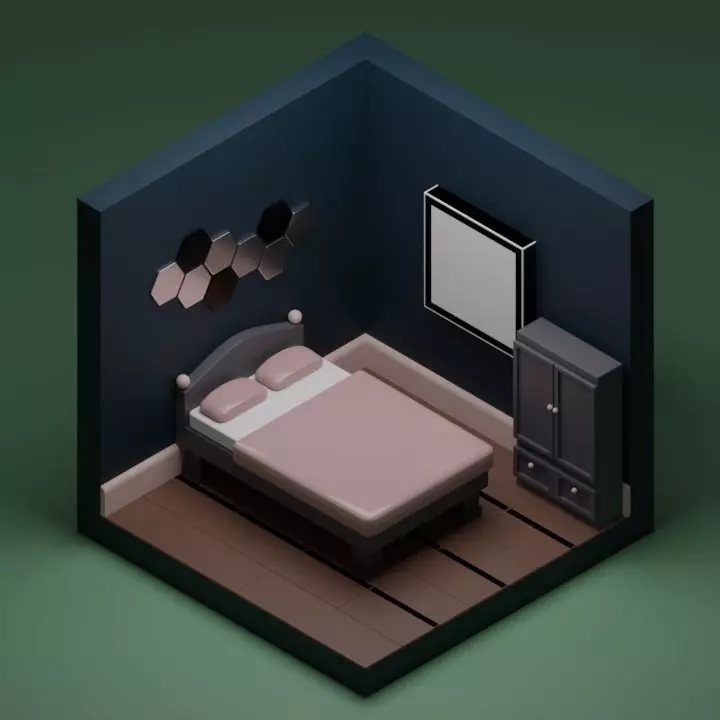High-Quality Design: Includes a bed, wardrobe, wall decor, and flooring, arranged in a cozy, minimalist layout.